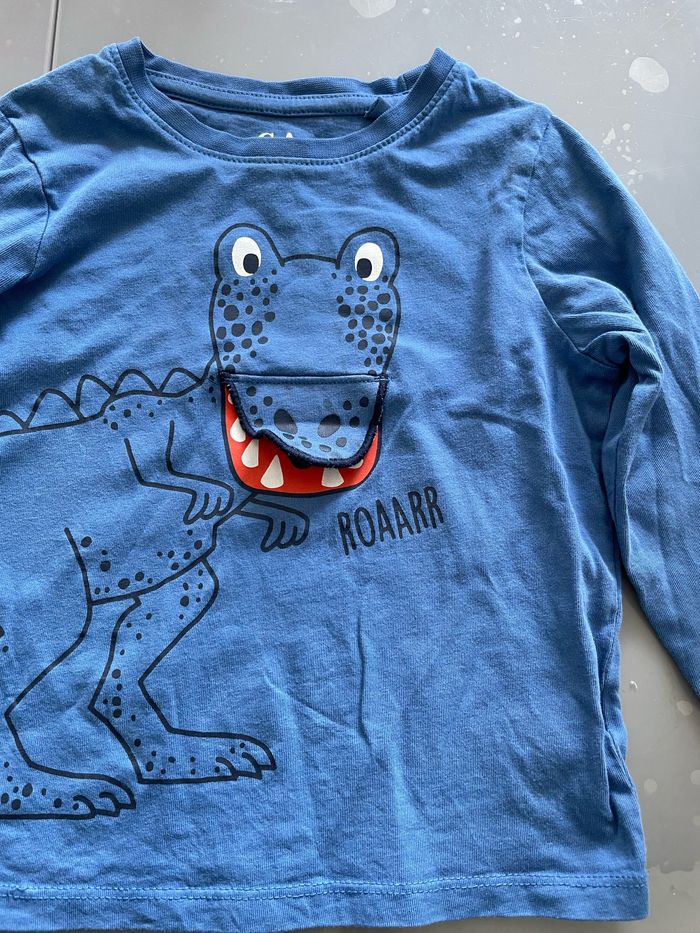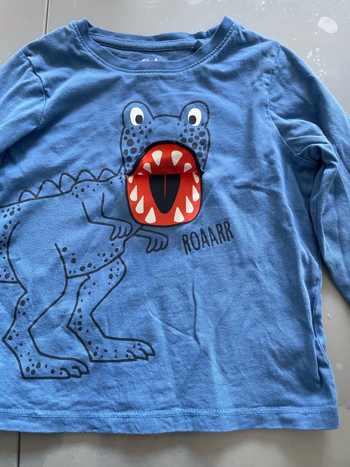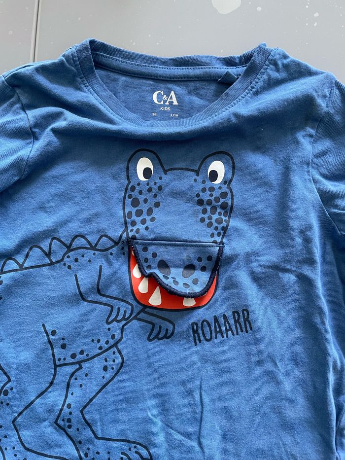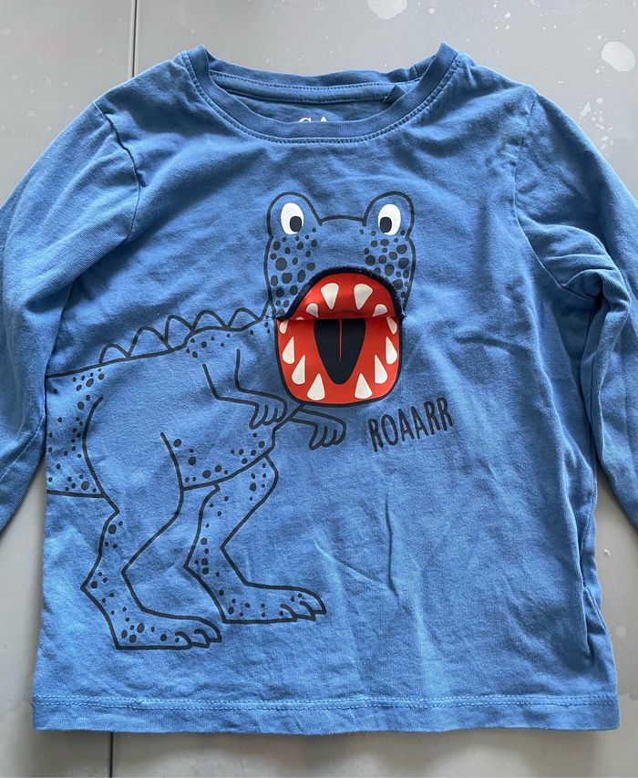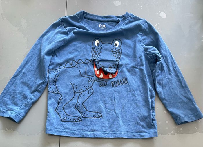 Tee-Shirt garçon T 3 ans C&A Couleur bleu avec joli dessin dessin dinosaure 🦕 noir et bouche qui s’ouvre très rigolo Manches longues Bon état