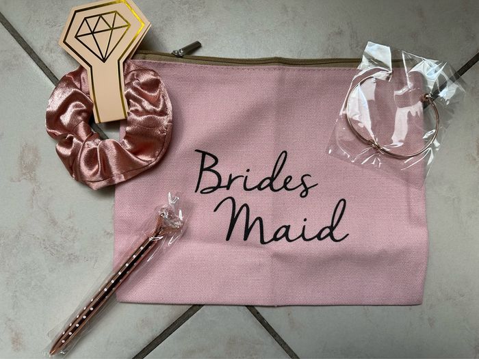 Coffret demoiselle d’honneur. Tout neuf, envoie dans son paquet d’origine, prêt à être offrir ou utiliser. Il comporte : - mug avec paille et goupillon - bracelet - elestastique - pochette