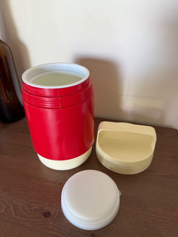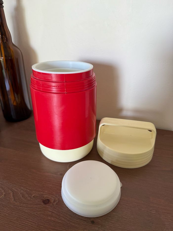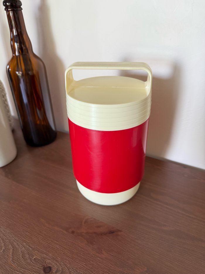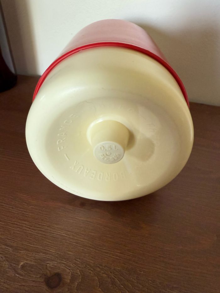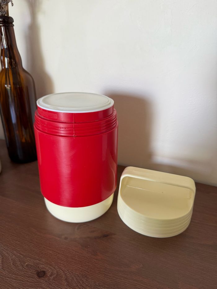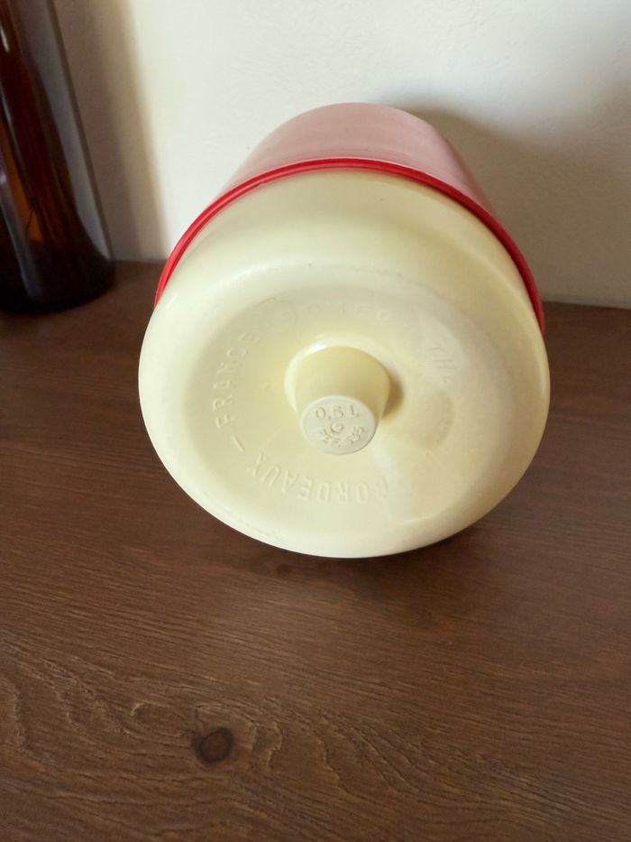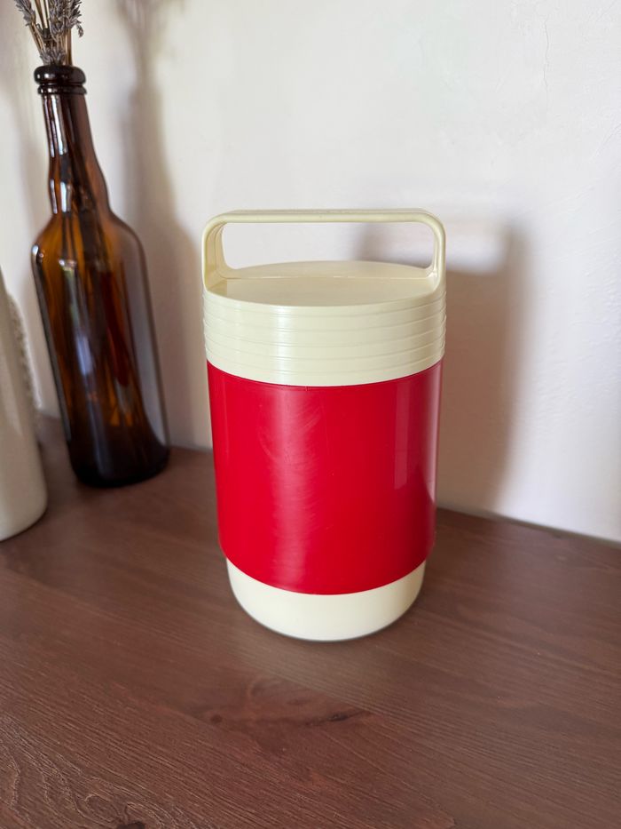 Thermos en plastique avec couvercle à vis Vintage THERMODOC France Beige et rouge Contenance 0.5 L Hauteur 20 cm Diamètre 12 cm