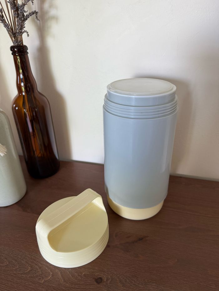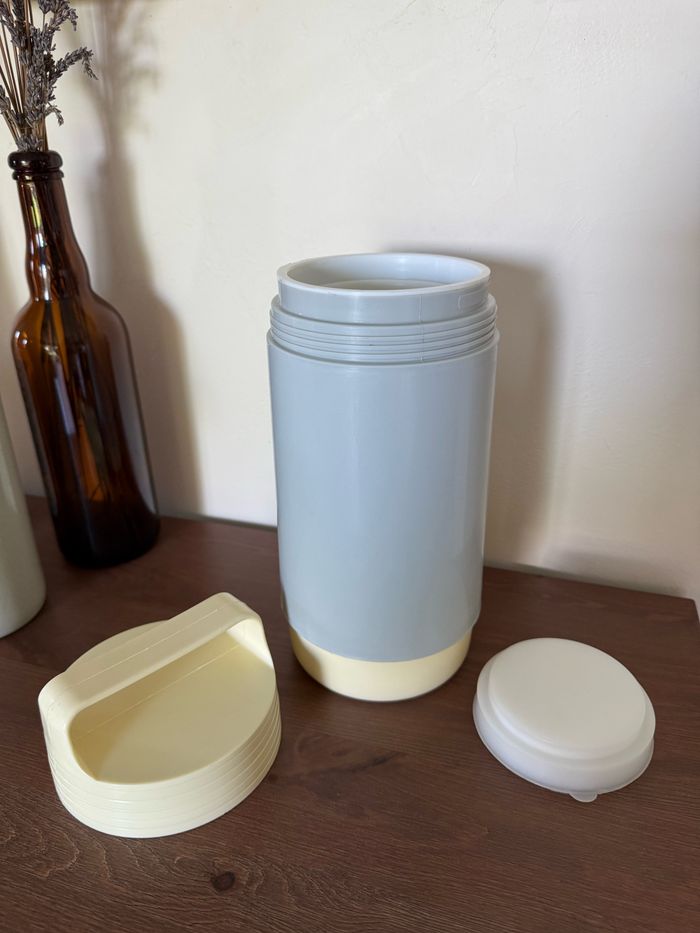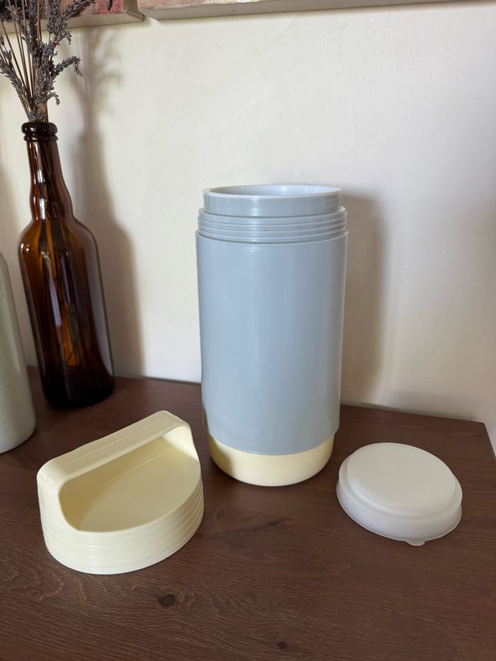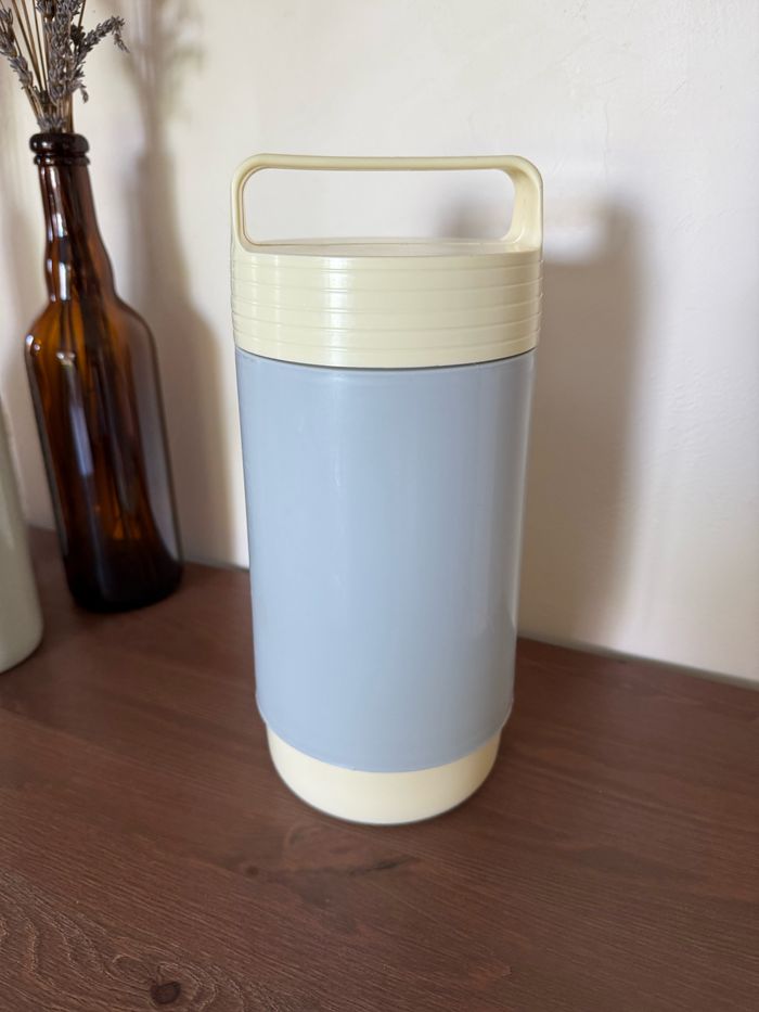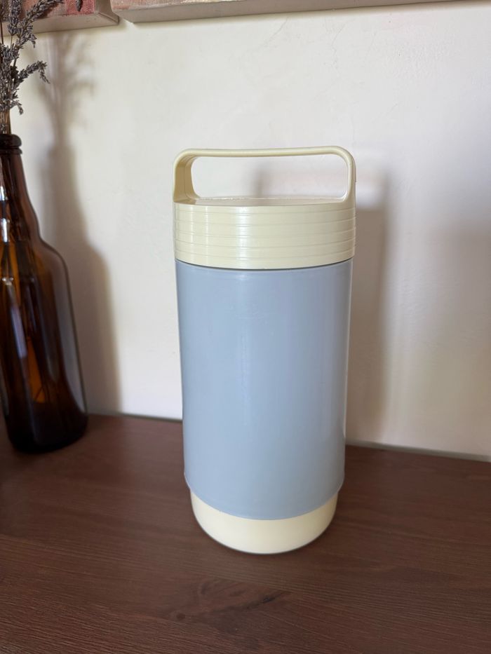 Thermos en plastique avec couvercle à vis Vintage THERMODOC France Beige et gris Contenance 1 Litre Hauteur 27 cm Diamètre 12 cm