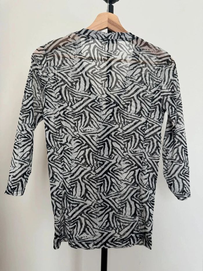 top boutonné à manches mi-longues à motifs zèbres noir et blanc gris ton sur ton décolleté profond en V en matière élastique semi-transparent en taille M de chez Mexx Metropolitan en très bon état