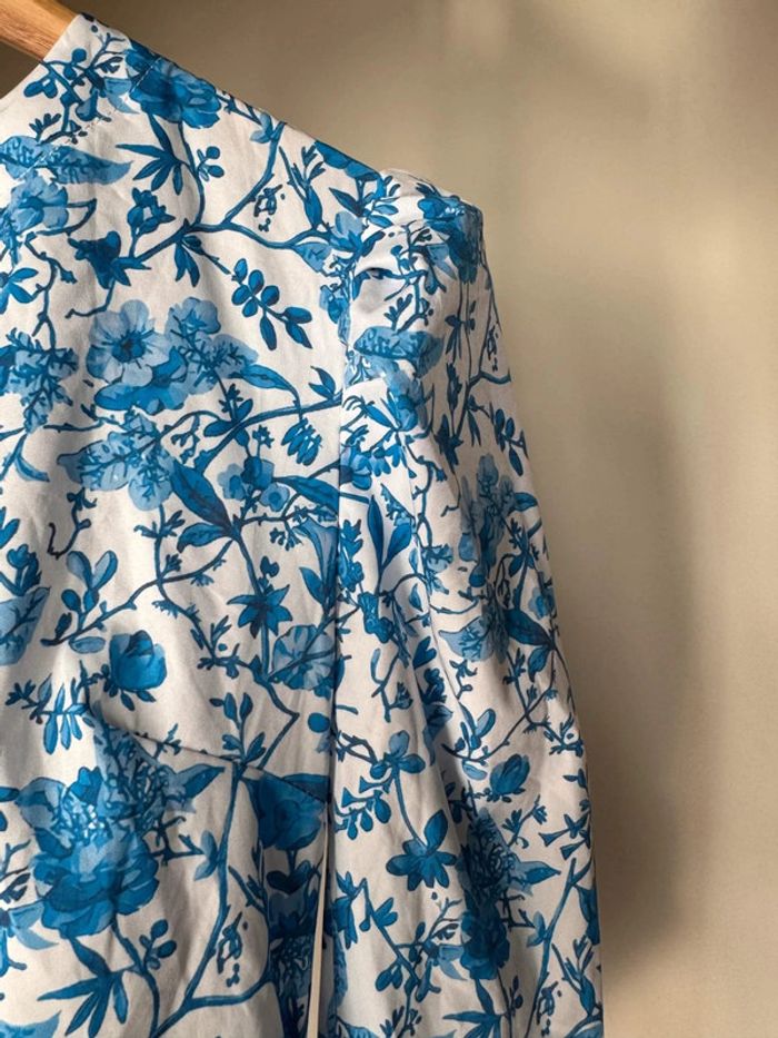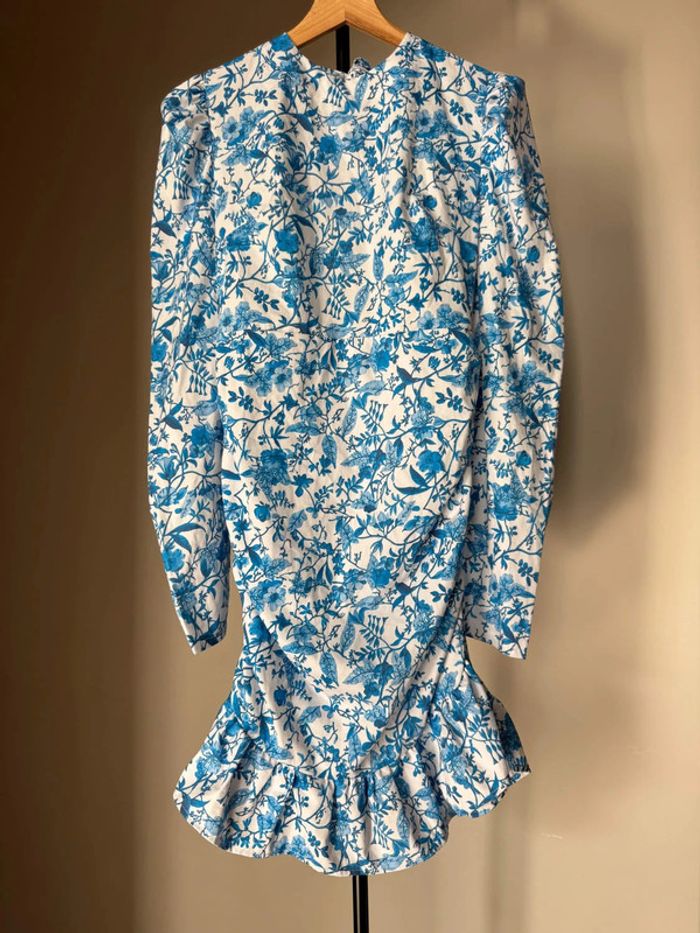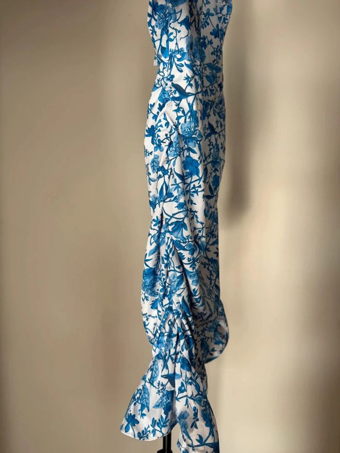 Robe courte d'été blanche col haut noué sur le dos en partie dénudée fond blanc à motif imprimé floral bleu coupe ajusté grâce à l'élastique sur la taille à l'arrière plissé sur les côtés avec volant évasée décoratifs au bas style rétro chic en taille L Porté une seule fois