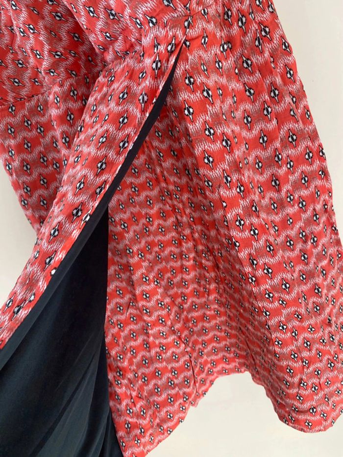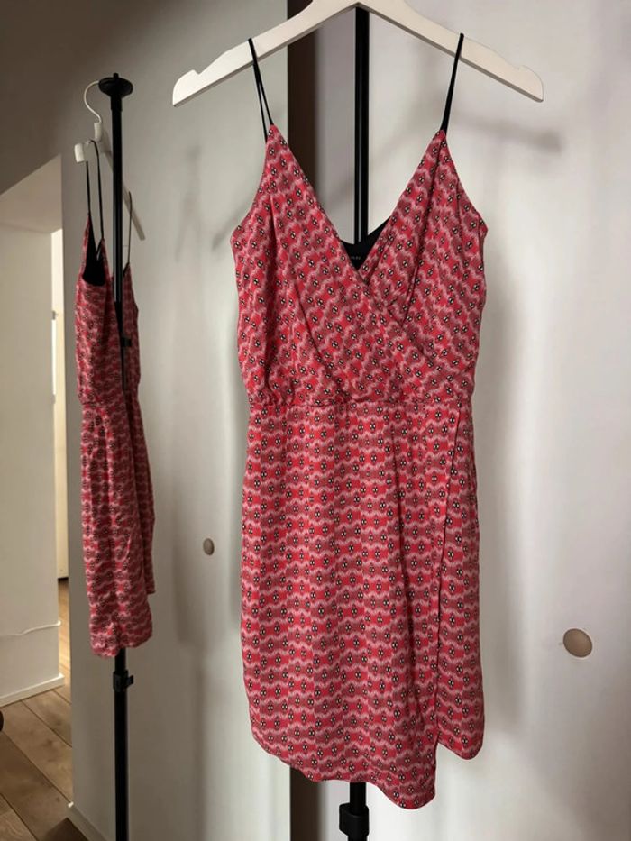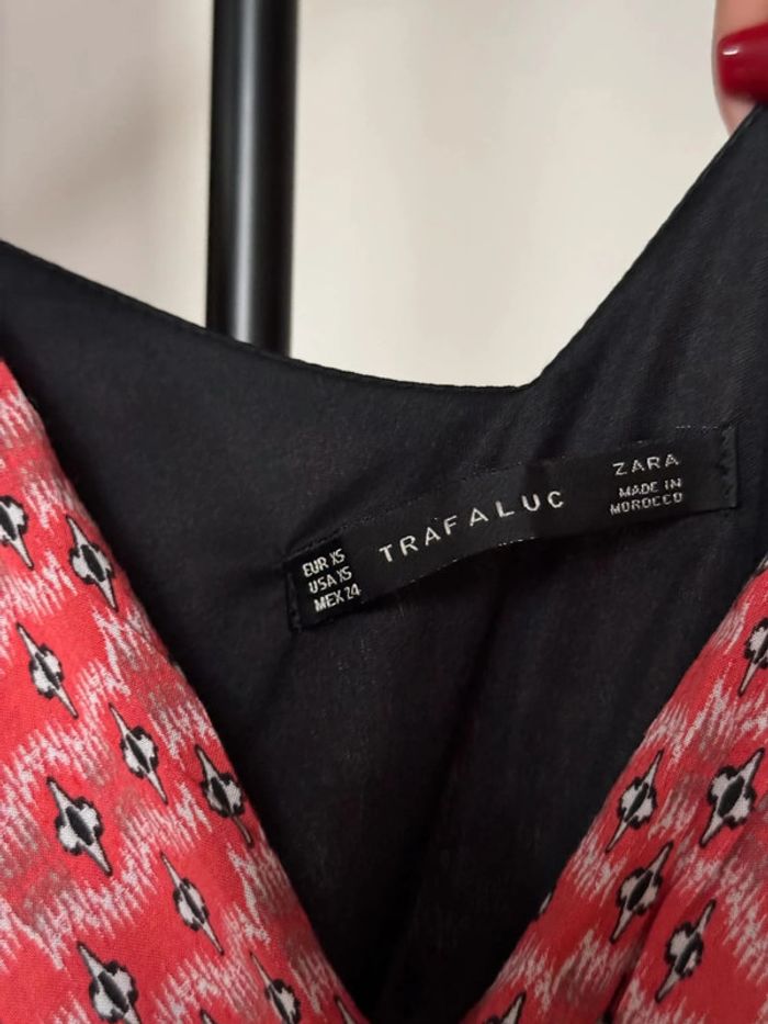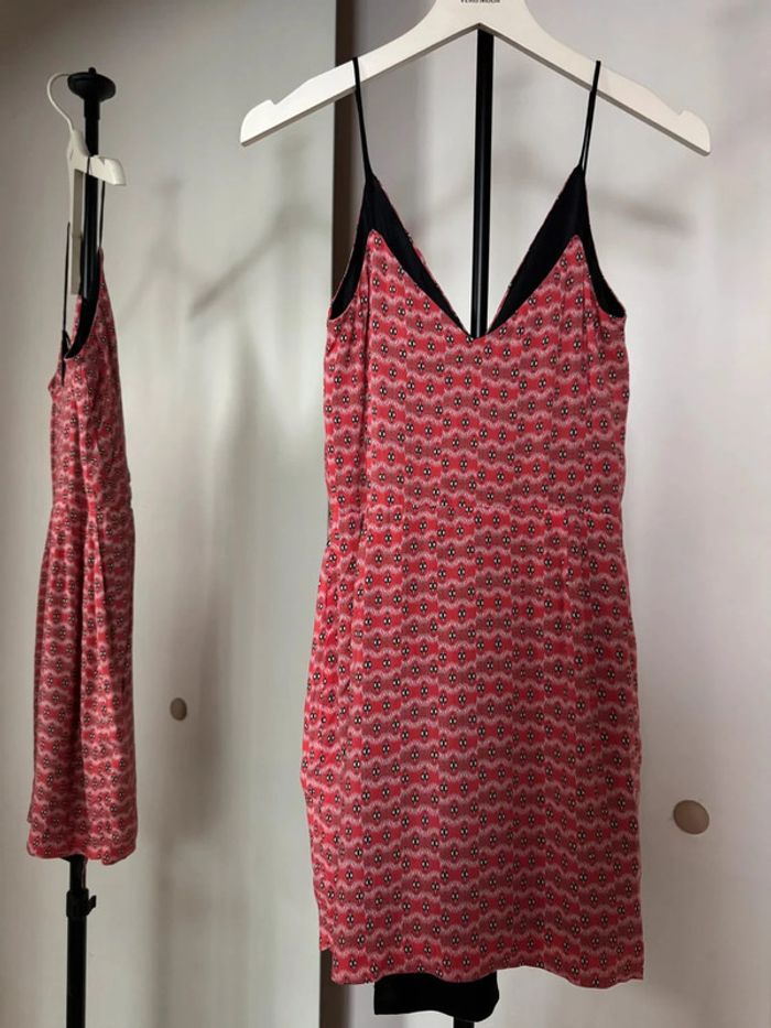 Robe d’été courte bretelles fines décolleté en v type cache-coeur à motifs forme abstrait corail rougeâtre noir blanc taille XS de chez Zara collection Trafaluc En très bon état