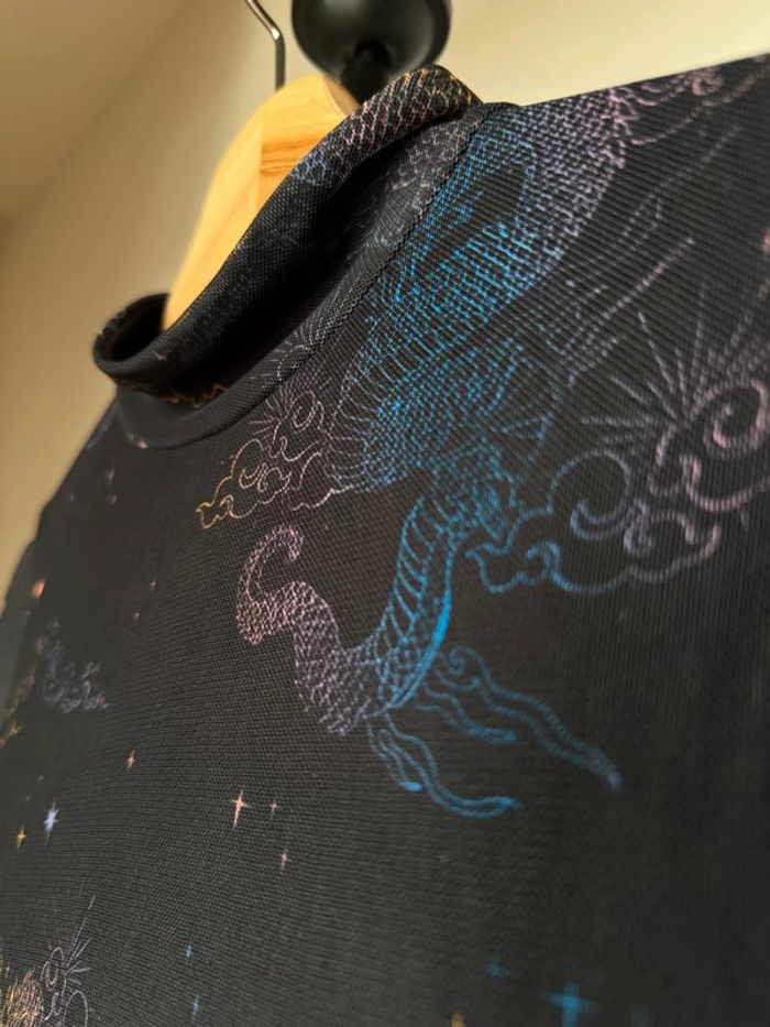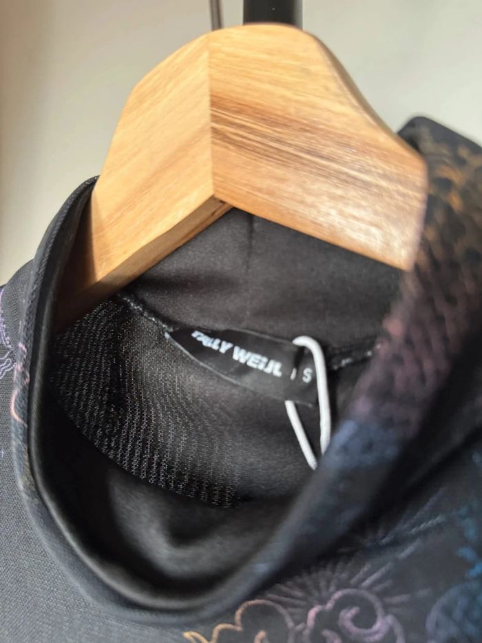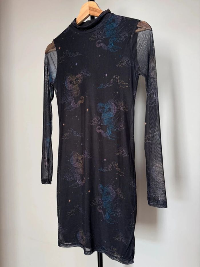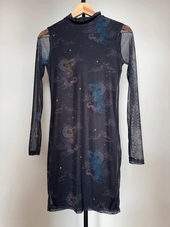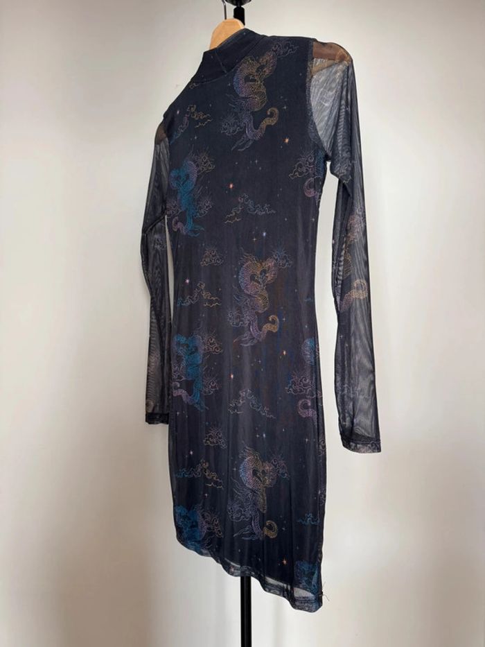 Robe noire courte moulante à manches longues en tissu semi transparent au niveau des bras avec doublure sur le corps à motifs imprimé dragon bleu rose col montant Style asie china mythique en taille S de chez Tally Weijl. Neuf avec étiquette Prix magasin 26€