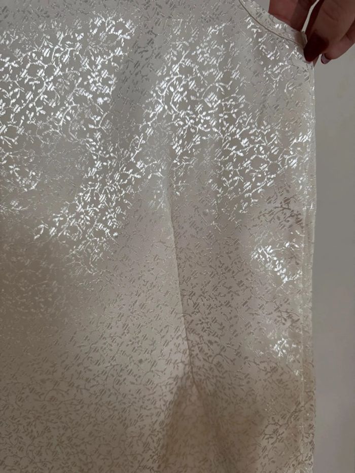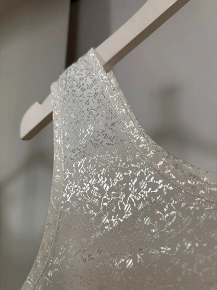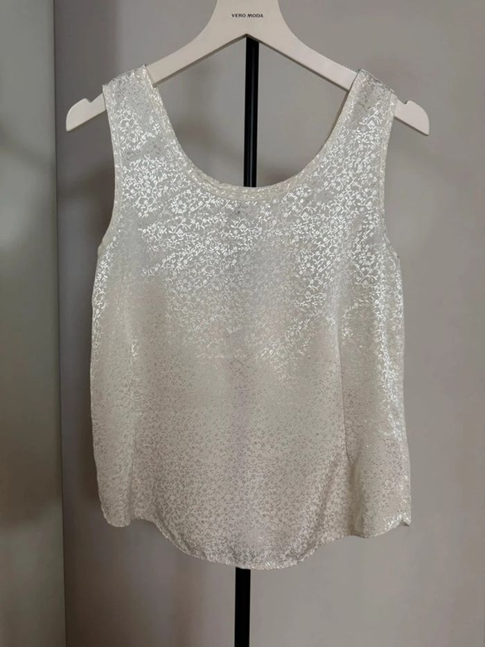 Top sans manches crème motifs ton sur ton brillant Pas d'étiquette avec la taille mais proche du XS demandez les dimensions si vous avez des doutes. En parfait état.