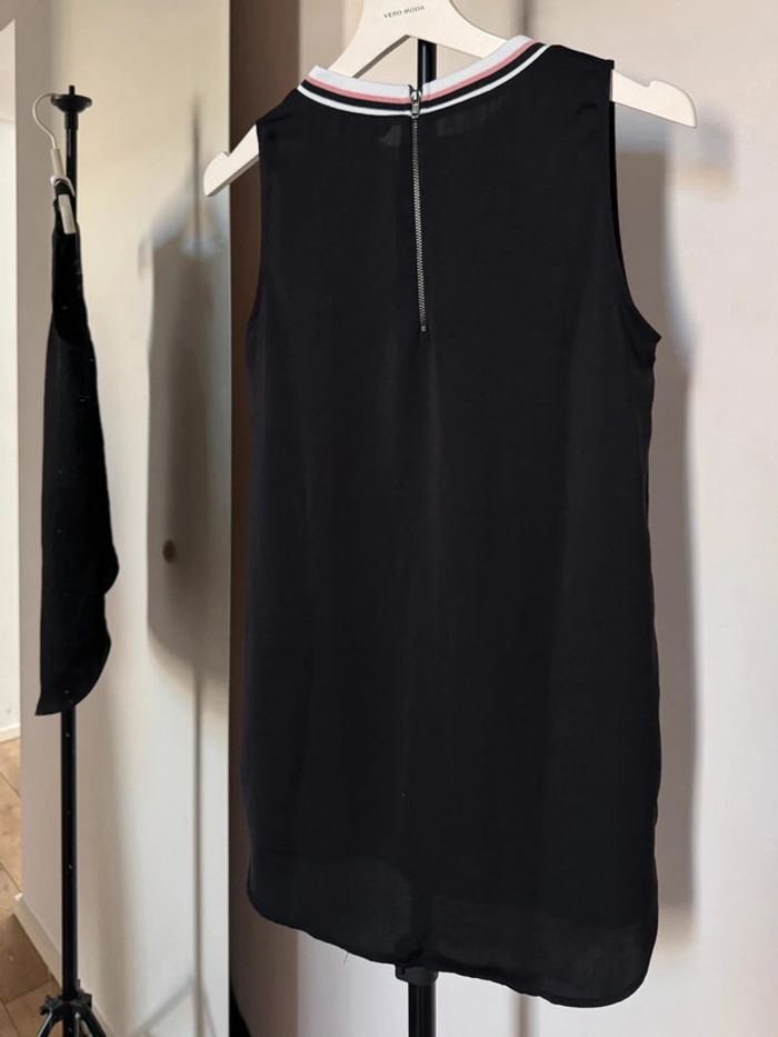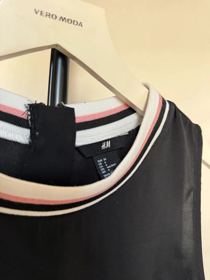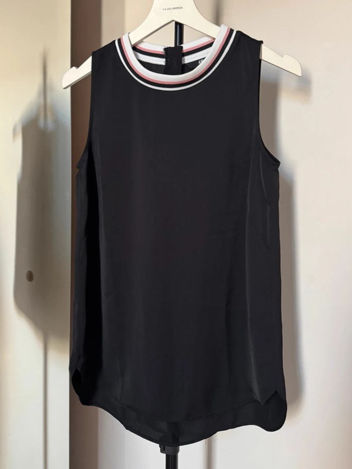 Top sans manches noir matière fluide, léger, coupe plutôt longue avec col rond montant en bande rose et blanc en taille 36 Largeur aisselles 43 cm de chez H&M. En très bon état