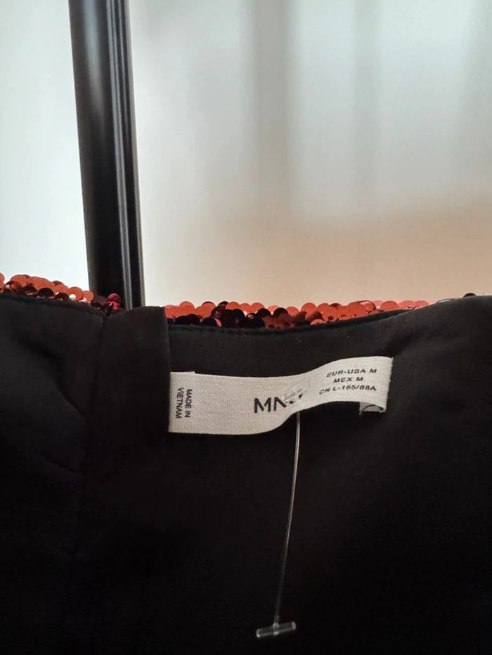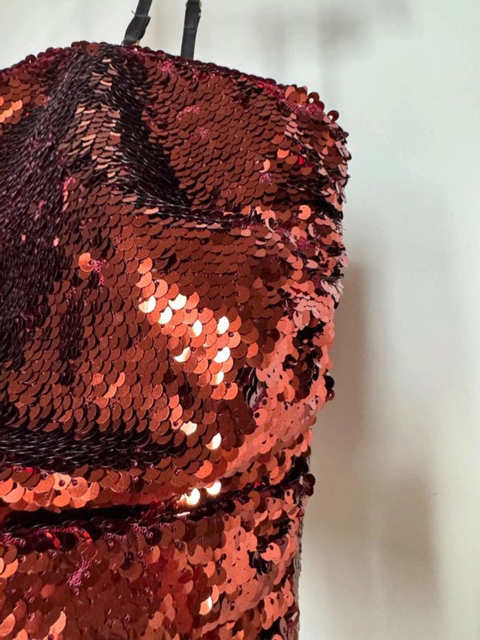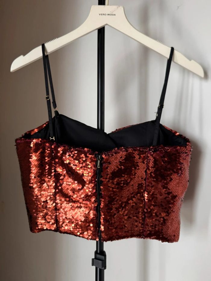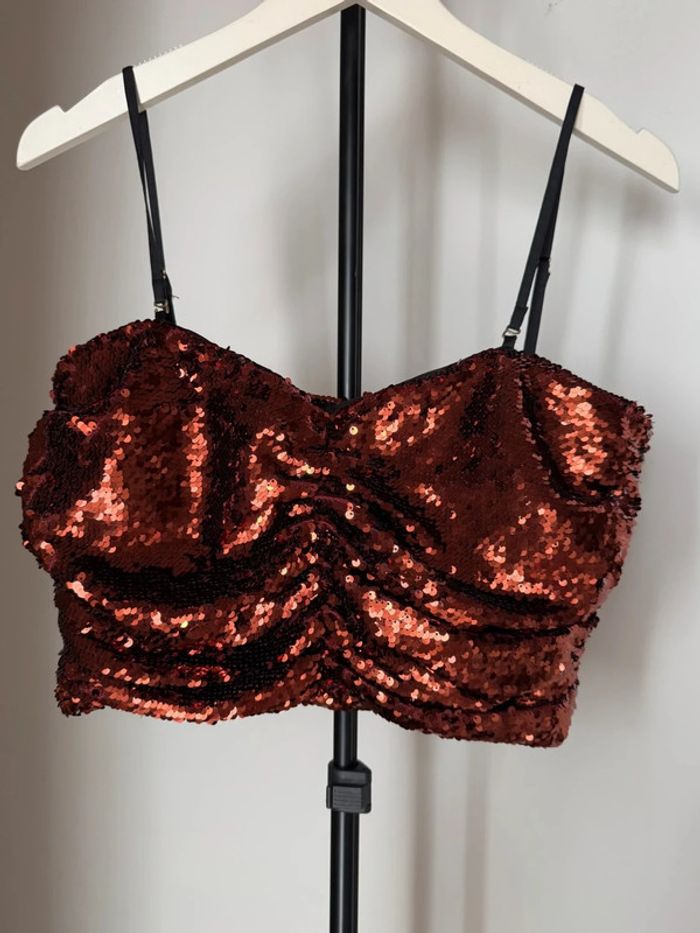 Top Bustier crop court à sequins corail rouge foncé les bretelles amovible peuvent être enlevées pour effet épaules dénudées en taille M de chez Mango Neuf sans étiquette. Prix d’achat 35€.