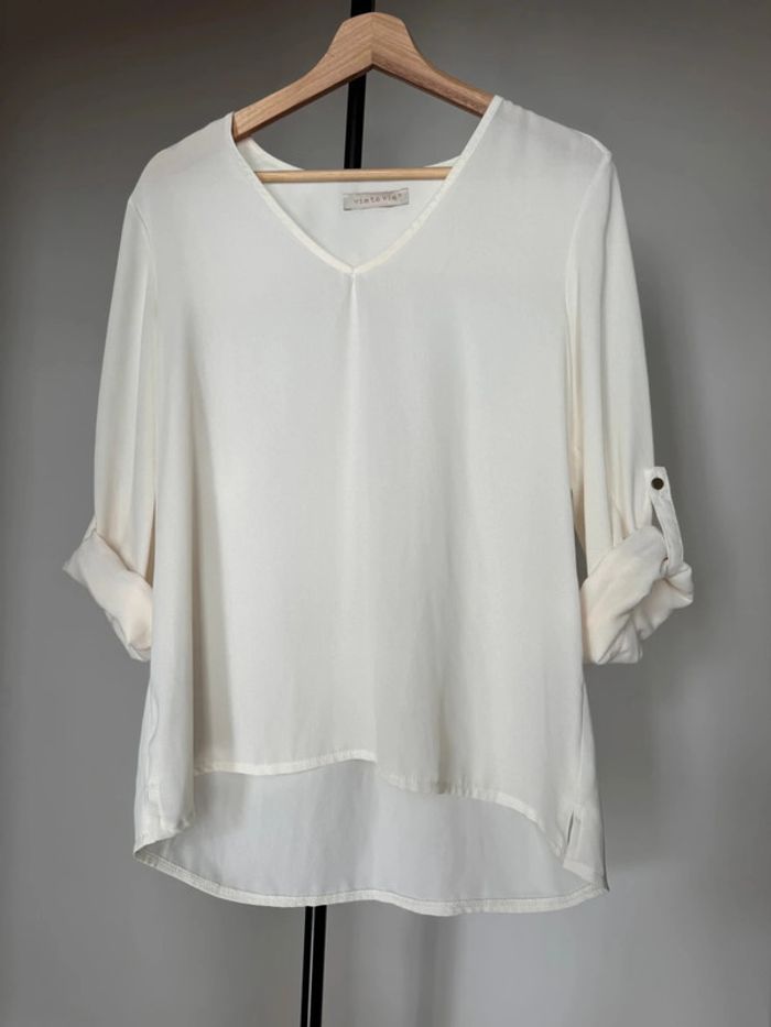 Blouse manches nouées crème matière fluide décolleté en V En taille 2 Fabriqué en France de chez Vie ta vie. En très bon état