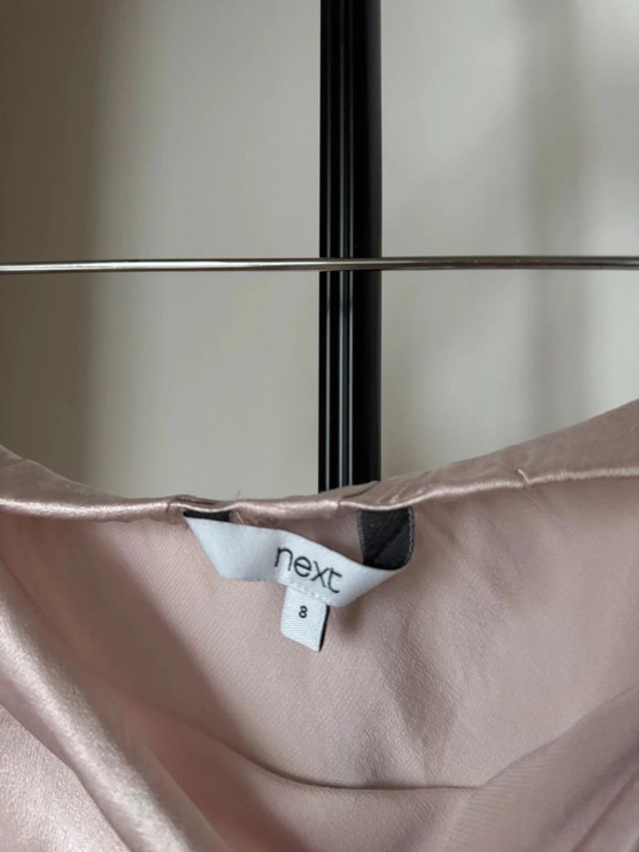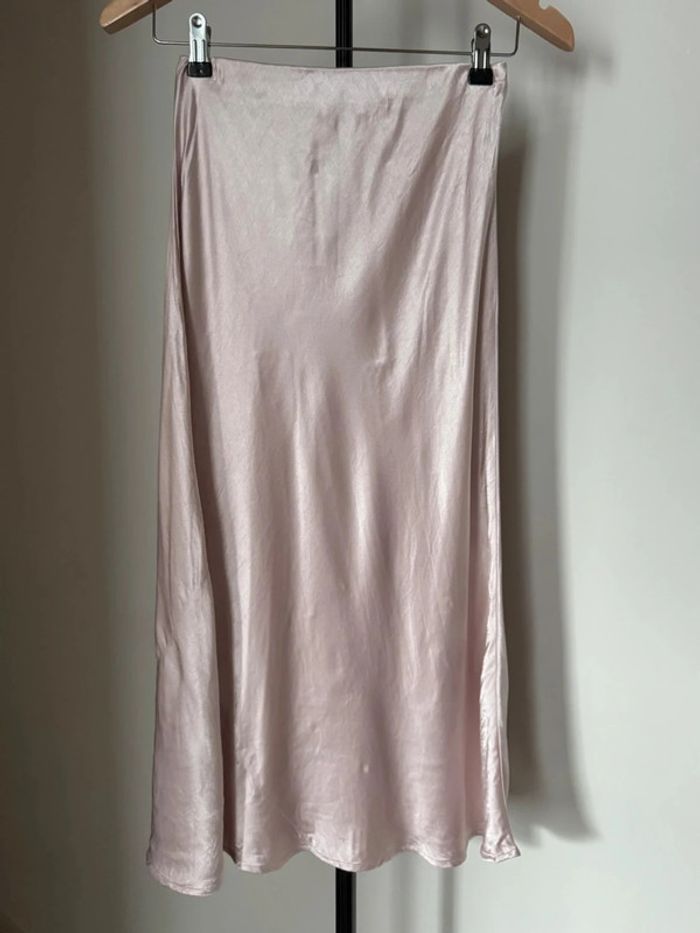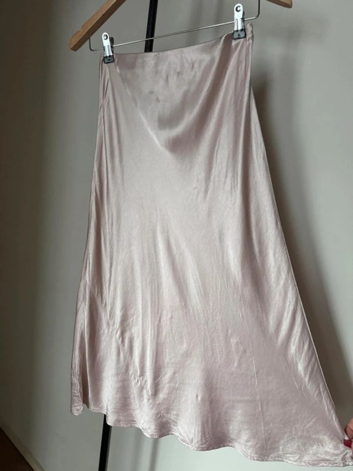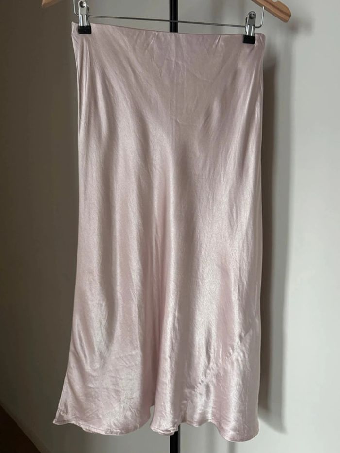 Jupe mi-longue environ 80cm en satin rose clair tissu élégante fluide satiné avec élastique au niveau de la taille coupe légèrement évasée en taille 8 / 36 de chez Next. En très bon état.