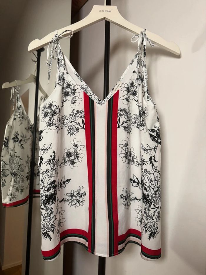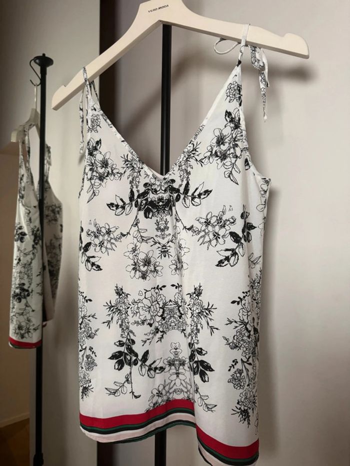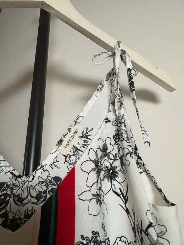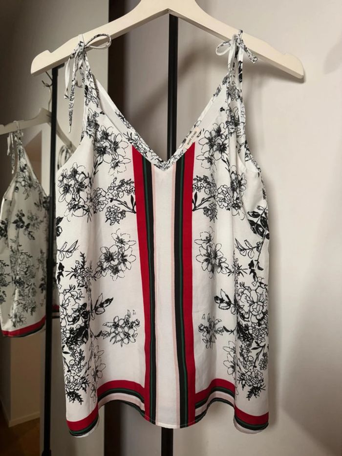 Top col en V sans manches bretelles fines avec faux noeud à motif de fleurs noir avec bande rouge et verte en taille 34 de chez River Island En parfait état.
