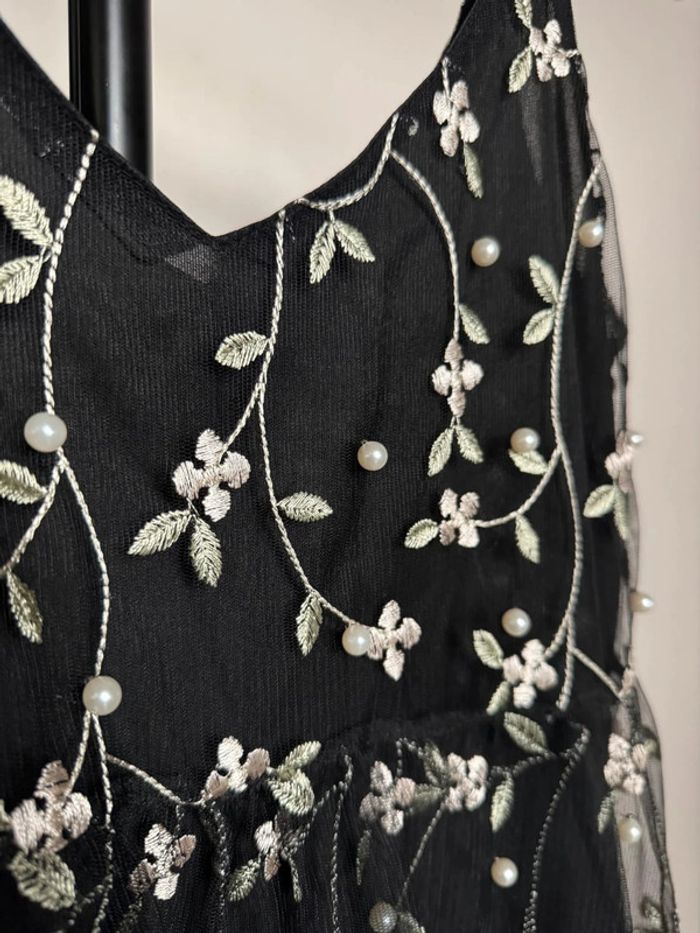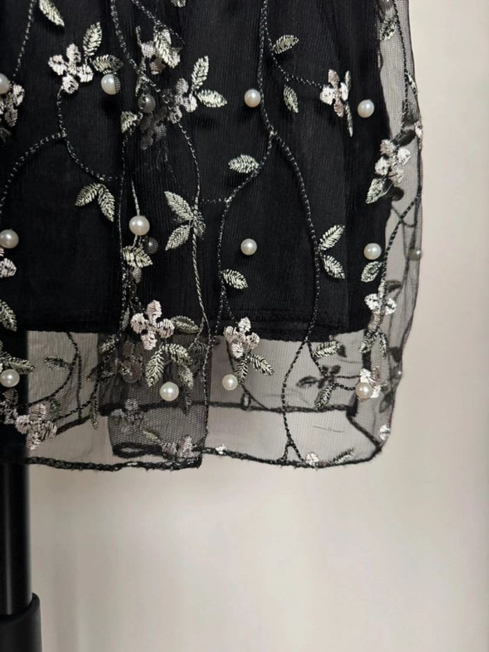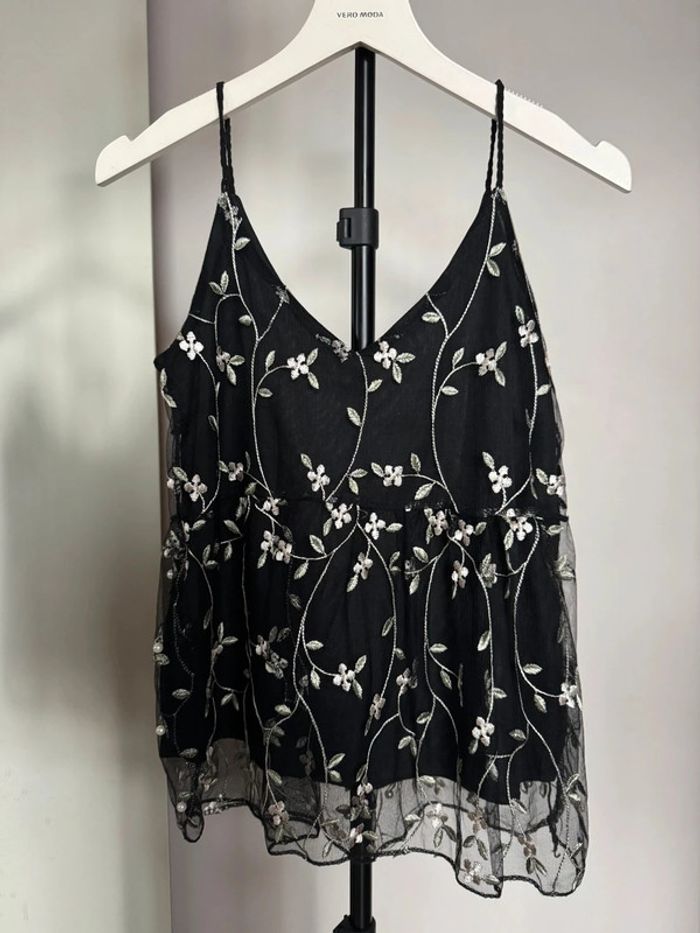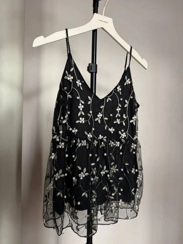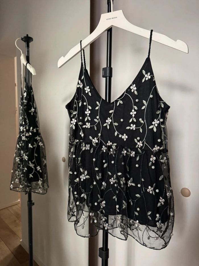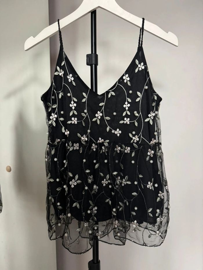 Joli top brettelles fines noir avec recouvert tissu voile motif fleur et détail de perle blanches. Pas d'étiquette mais proche de la taille XS. demandez les dimensions en cas de doutes. En très bon état.