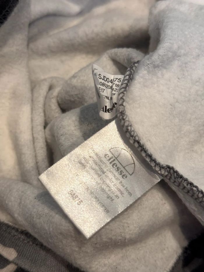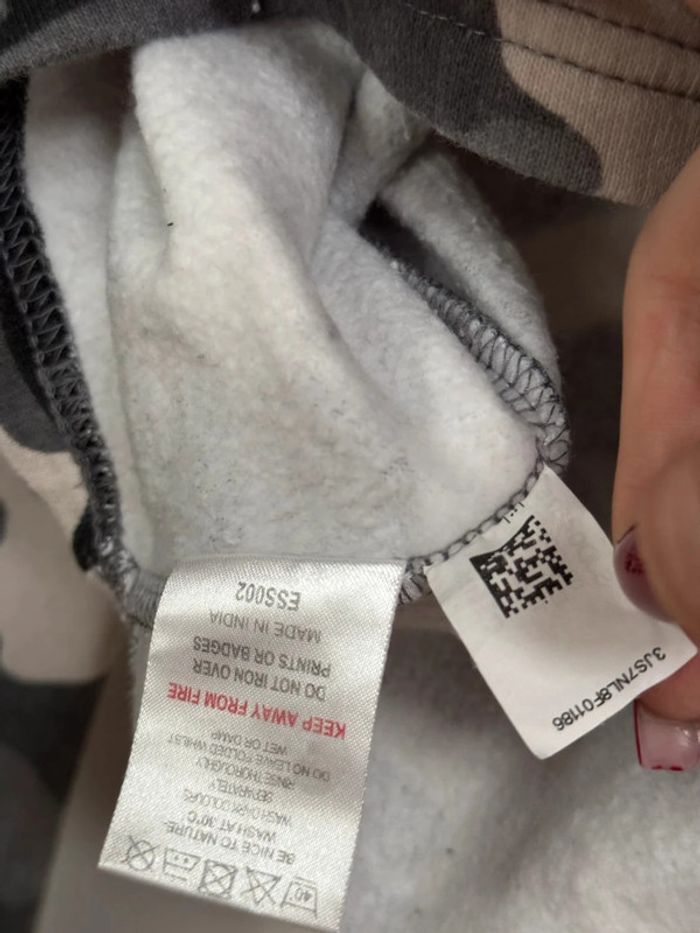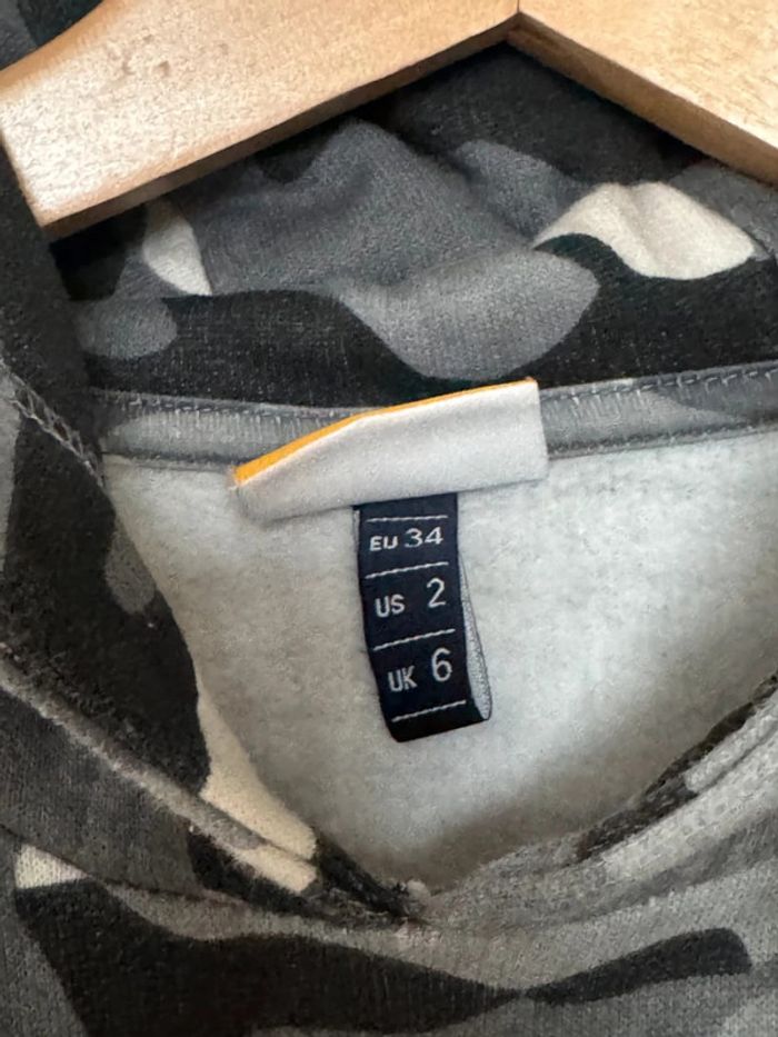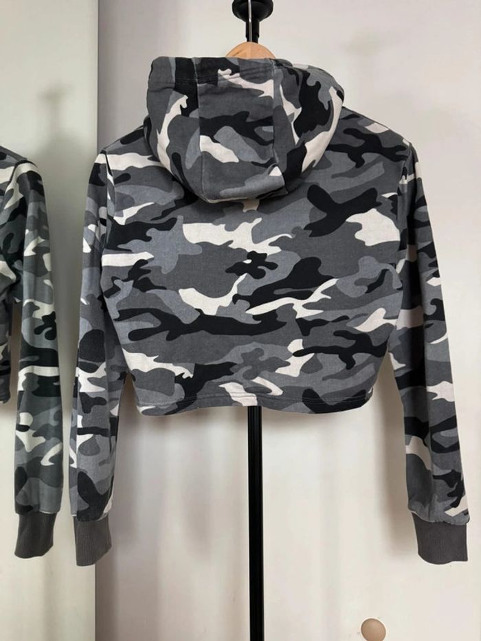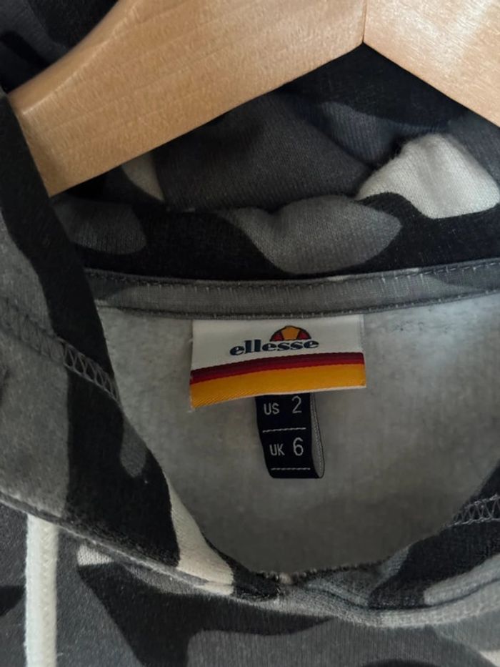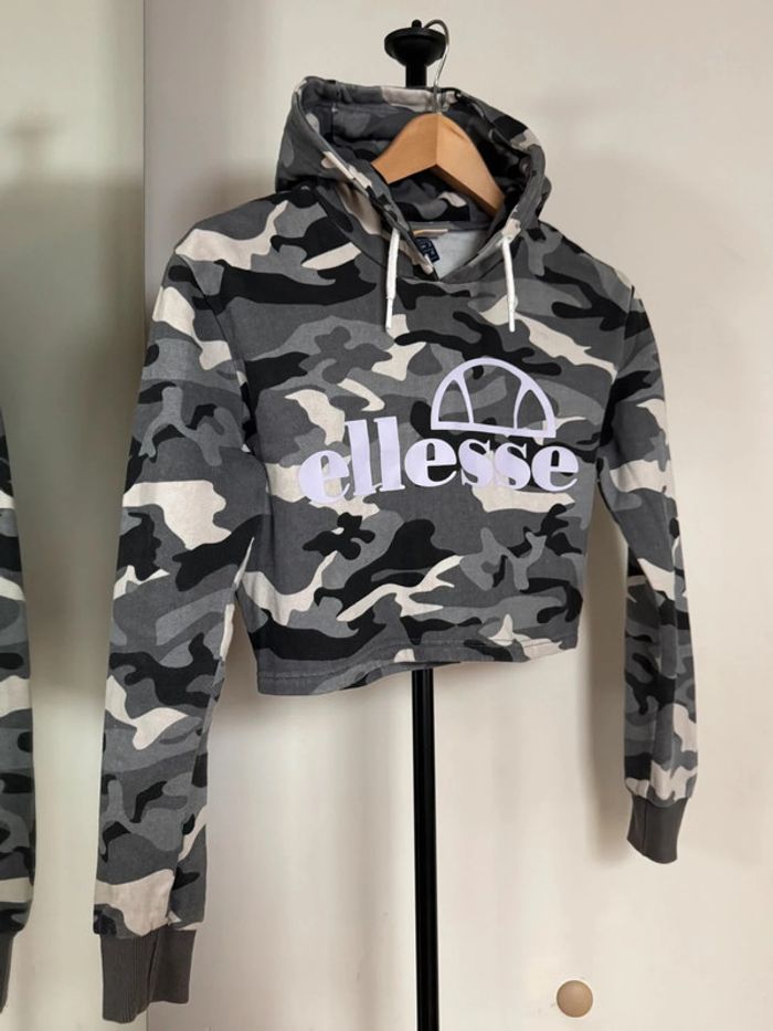 Sweat à capuche manches longues coupe court motif militaire type camouflage imprimé logo couleur lila tons gris noir et beige crème en taille eu 34 us 2 uk 6 de chez Ellesse, Porté, en bon état général. Largeur d'aisselle 46