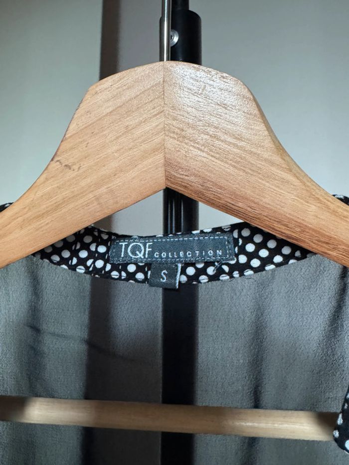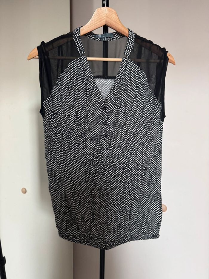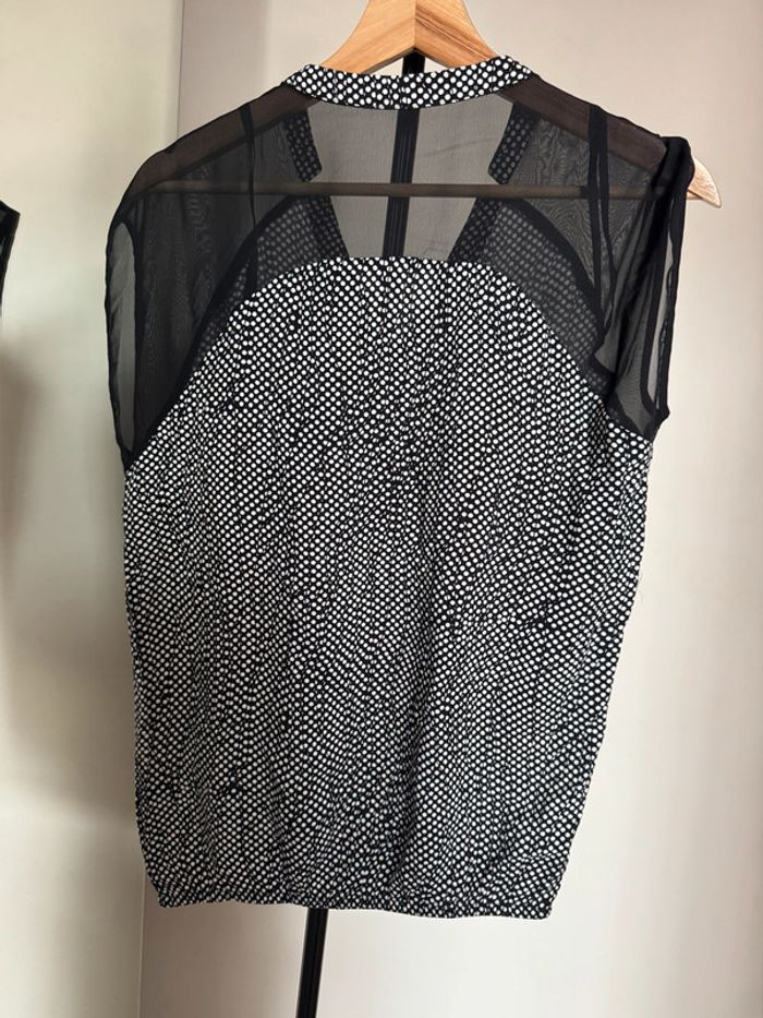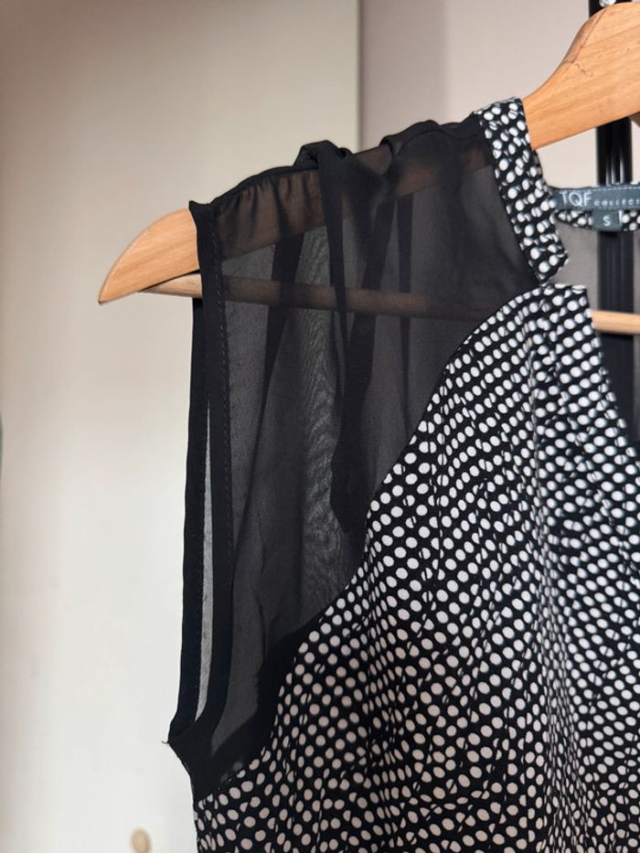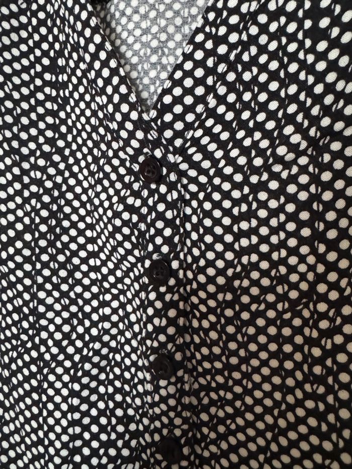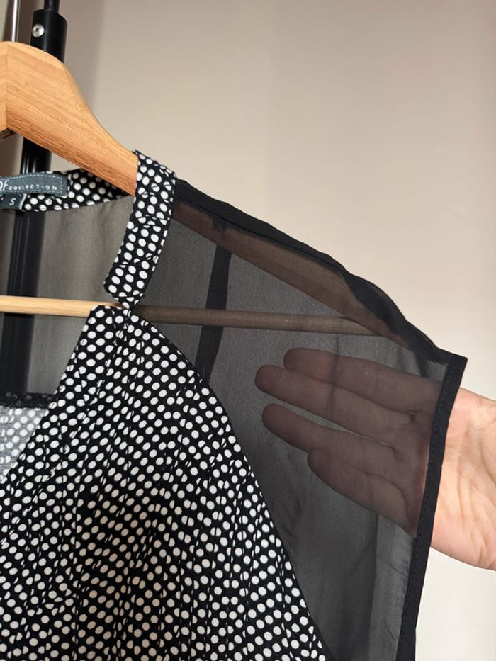 blouse d’été large fluide léger avec bouton sur le décolleté en v à motifs de petits points épaules voile transparent noir élastique sur le bas en taille S en très bon état