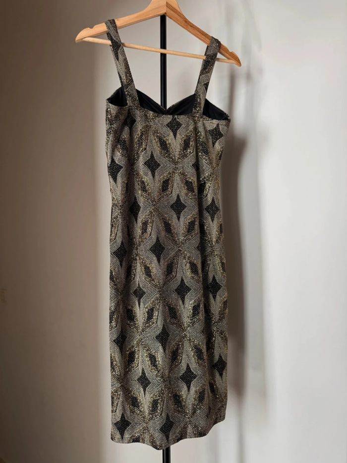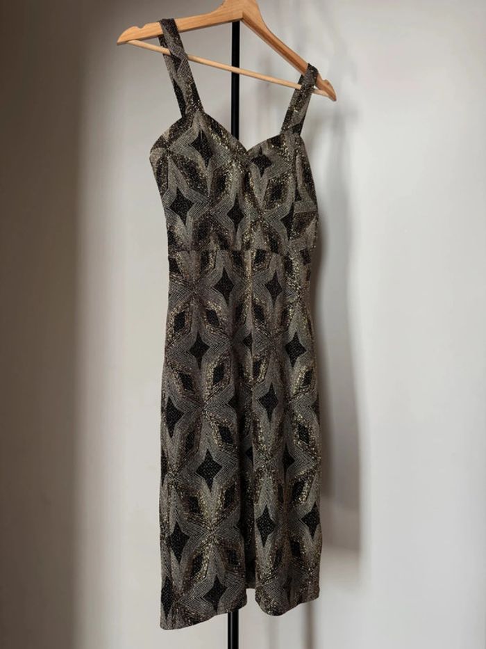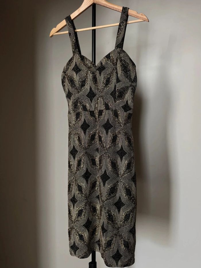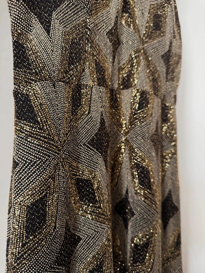 Robe de soirée moulante au corps ajusté sans manches avec bretelles larges à motifs de formes géométriques en véritables paillettes ton sur ton noir dorée argenté rembourrée au niveau de la poitrine décolleté en demi coeur longue environ genoux en taille 42 Matière extensible, mesure aisselle à aisselle à plat 40 cm, mais comme élastique ça va facilement jusqu'à 55 cm ou plus Jamais porté finalement