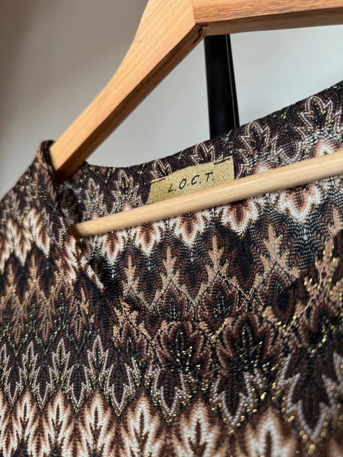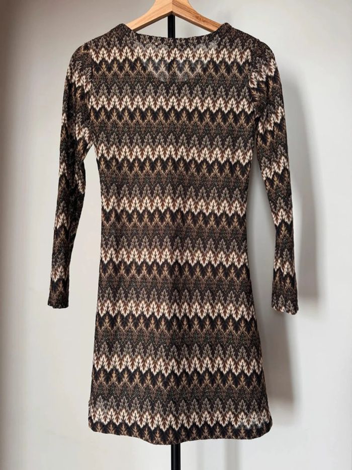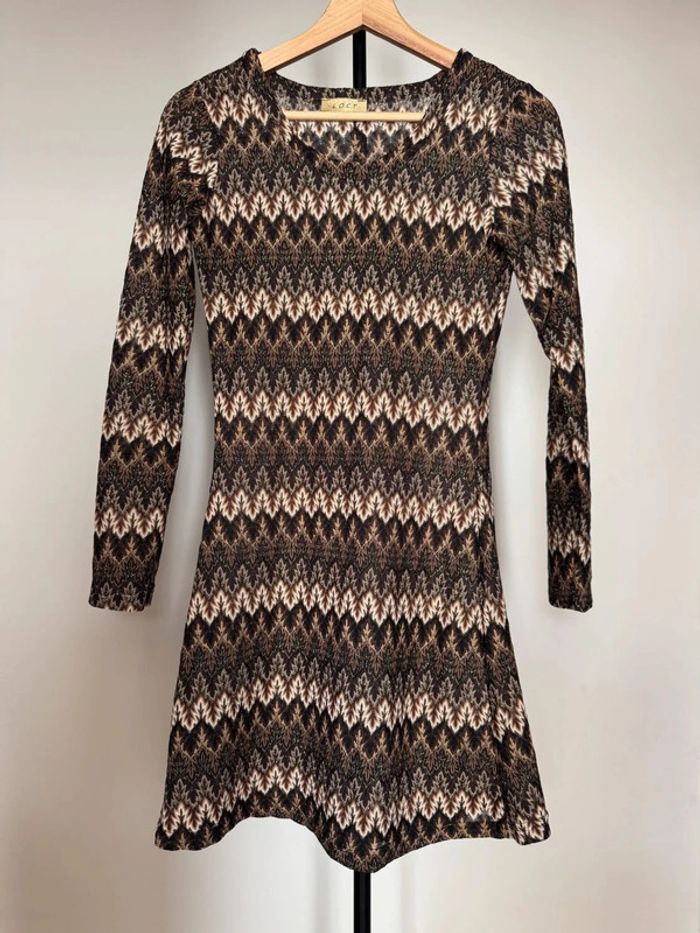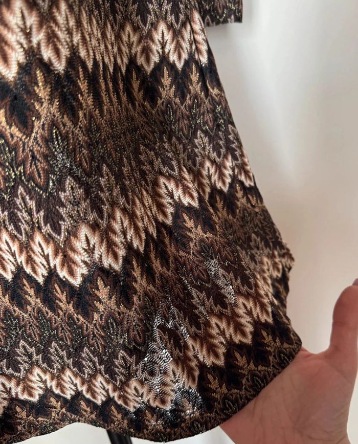 tunique ou robe courte brun beige marron style vintage rétro à motifs semi-transparente coupe ajusté et évasé en taille 1 (XS-S) en très bon état