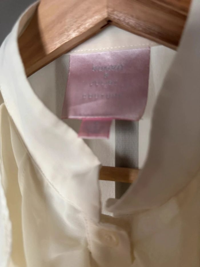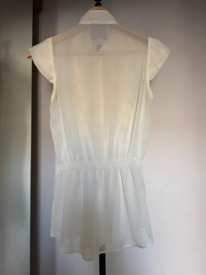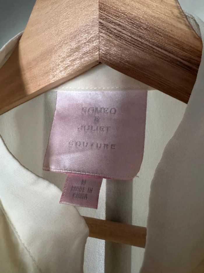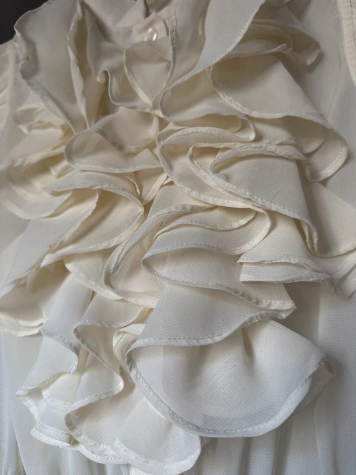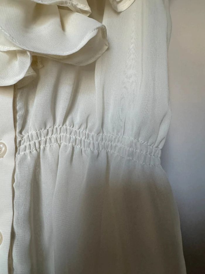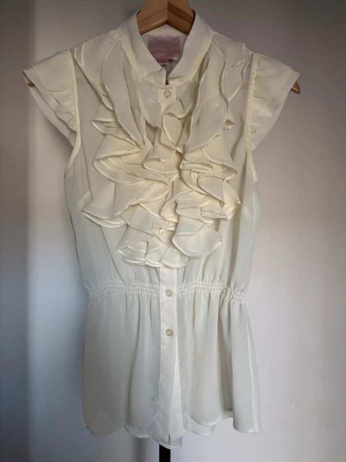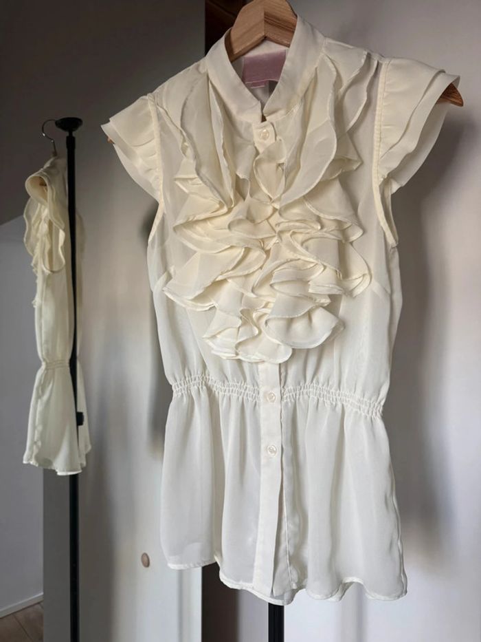 blouse boutonnée avec courte manchettes type chemisier crème, orné de volants sur le devant coupe cintré au niveau de la taille sur élastique style élégante et raffinée en taille M de chez Romeo & Juliet couture En très bon état
