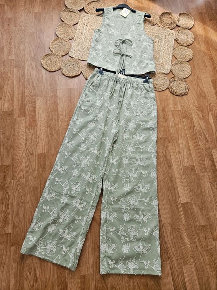 NON NEGOCIABLE Sublime ensemble bohème broderies de belle qualité. Couleur vert d'eau MP pour précision sur la taille #ensemble #ensemblefemmes #ensemblebohoheme #ensemblebroderie #ensemblepantalon #ensemblepantalongilet