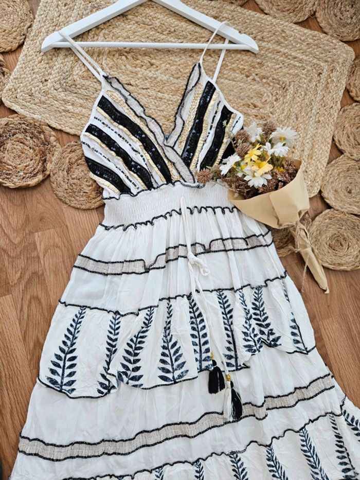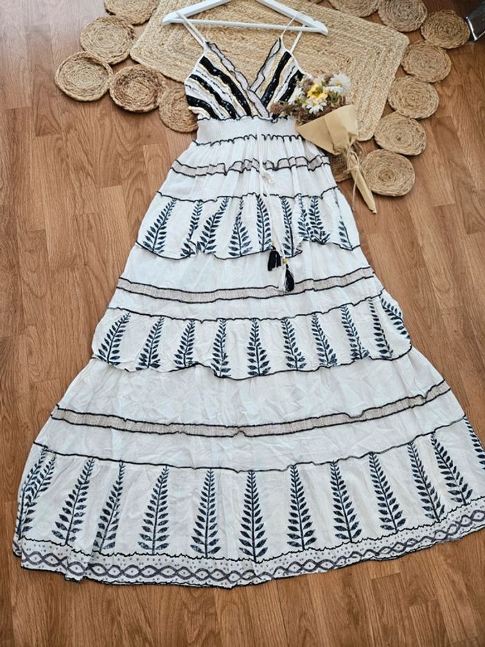 NON NEGOCIABLE Sublime robe volants et perles, bretelles réglable, dos smocké. #robe #robelongue #robeboheme #robeindia #robeete #robefemme