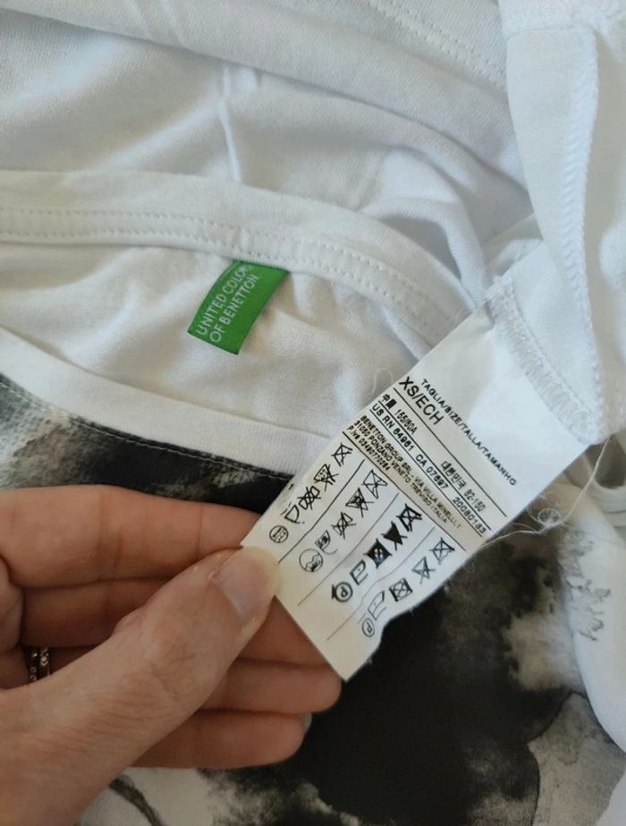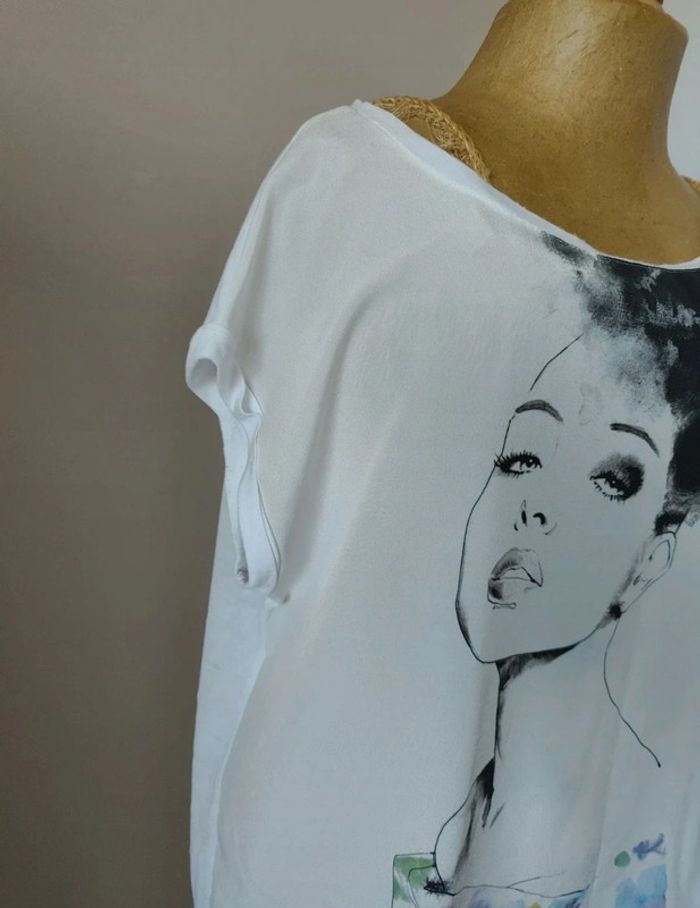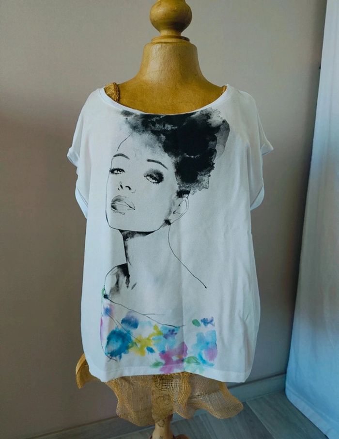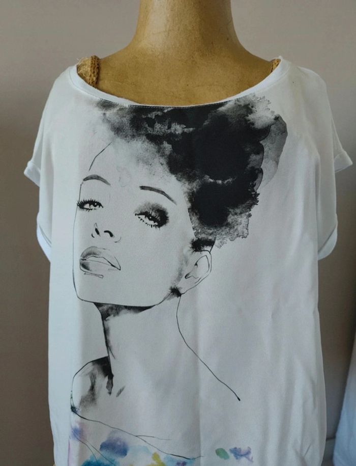 Tee-shirt blanc avec motif femme devant. Bi matière, avec effet blouse devant, et tee-shirt en coton à l'arrière. United colors of Benetton, taille XS mais peut convenir aussi à un S
