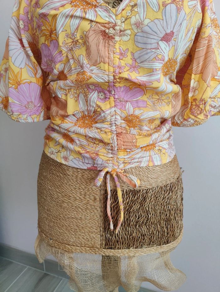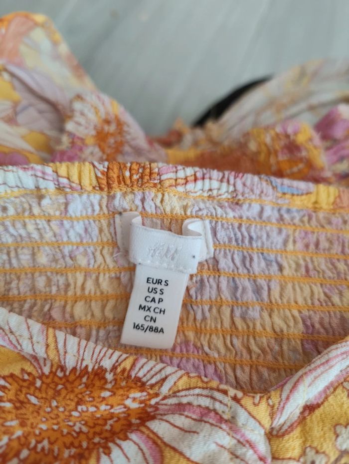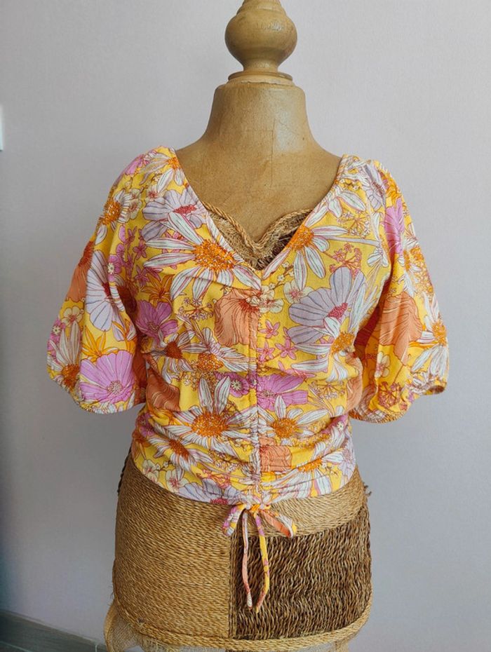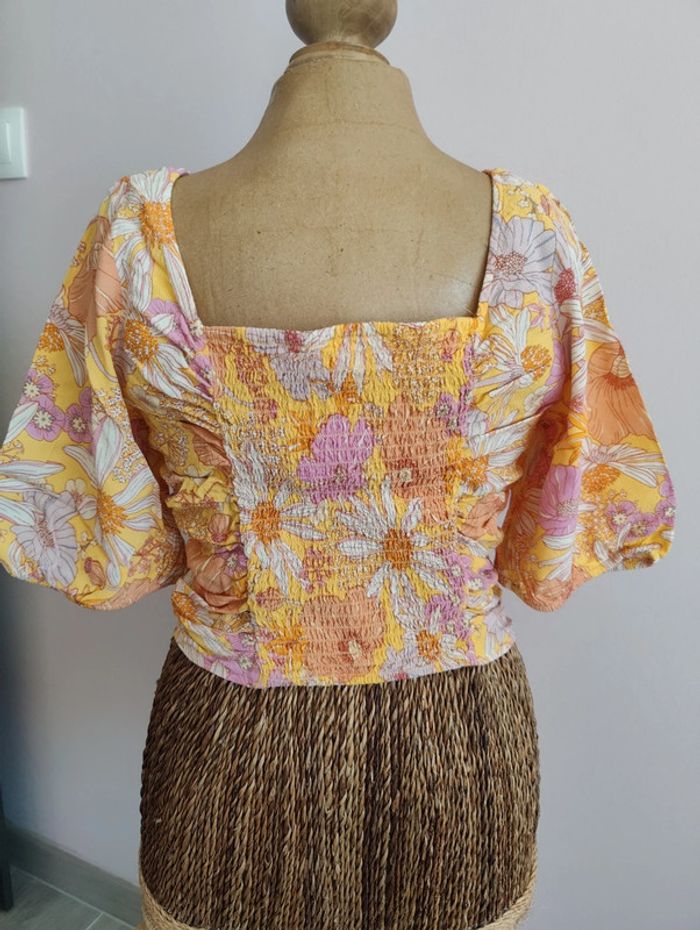 Top court aux belles couleurs d'été jaune, orange, rose. Dos en élastique froncé. H&M, taille S