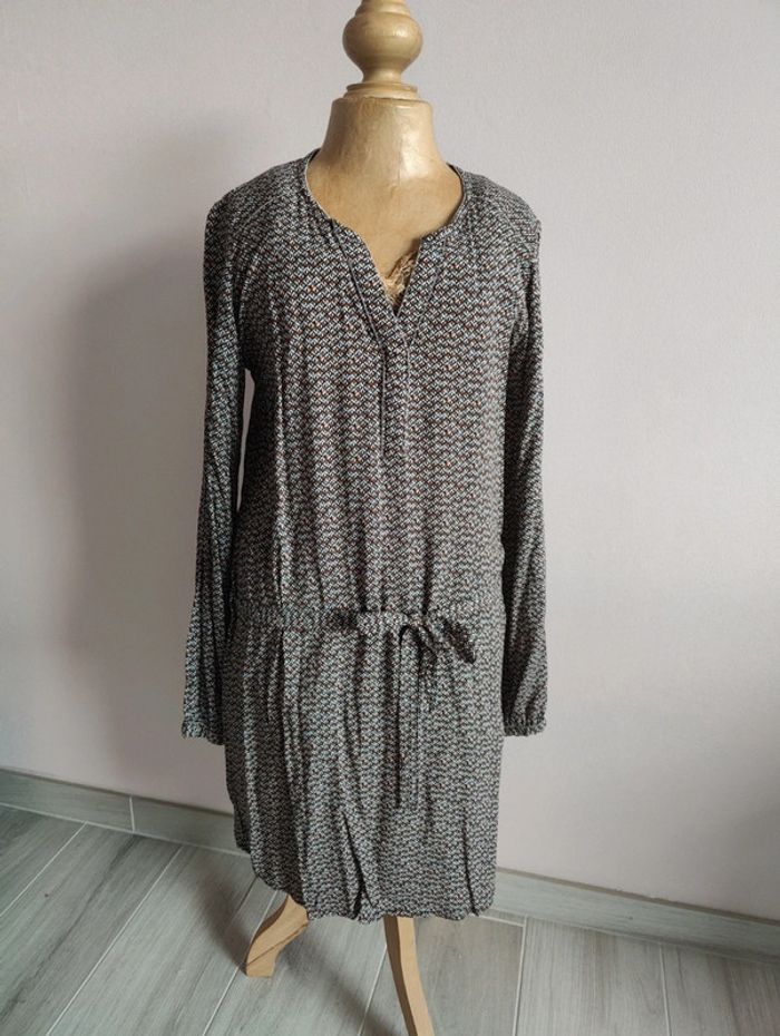Robe fluide à motifs, dans les coloris noir, camel, bleu et blanc. Avec petits détails billes argentées au col, épaules, et bout des manches. Cache Cache, taille 36