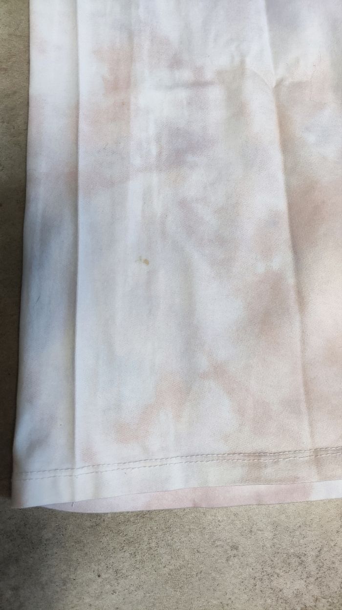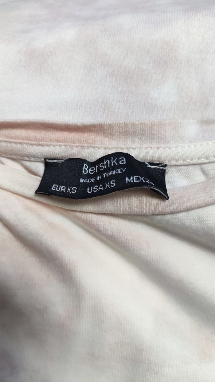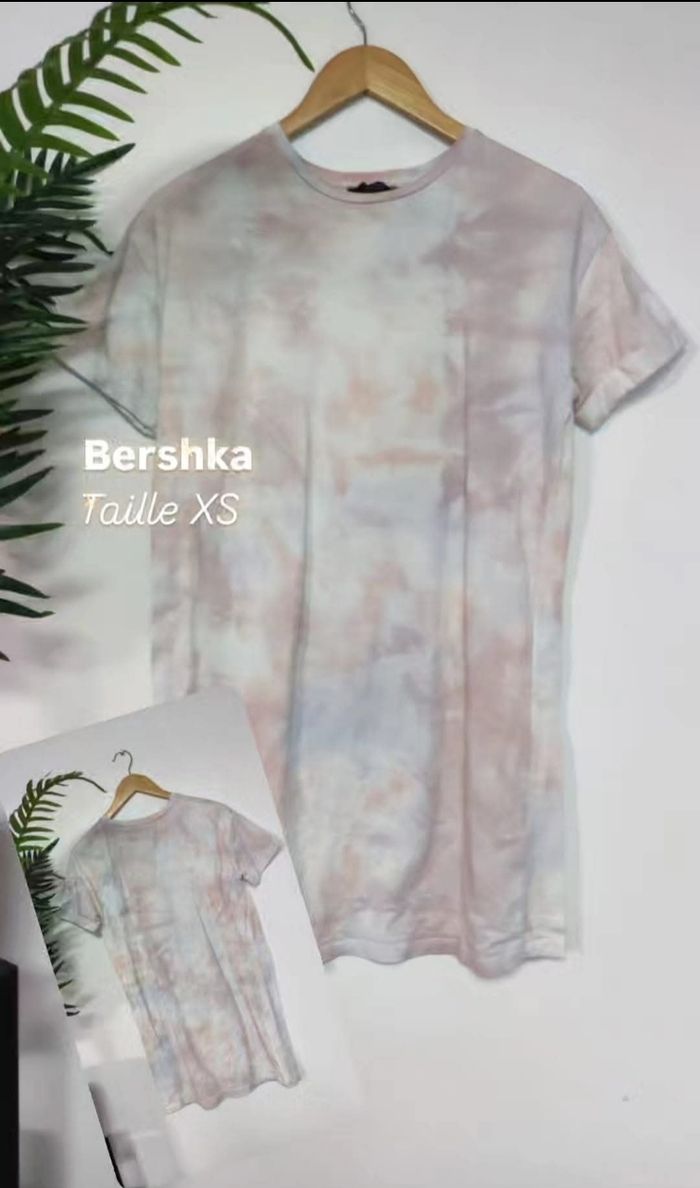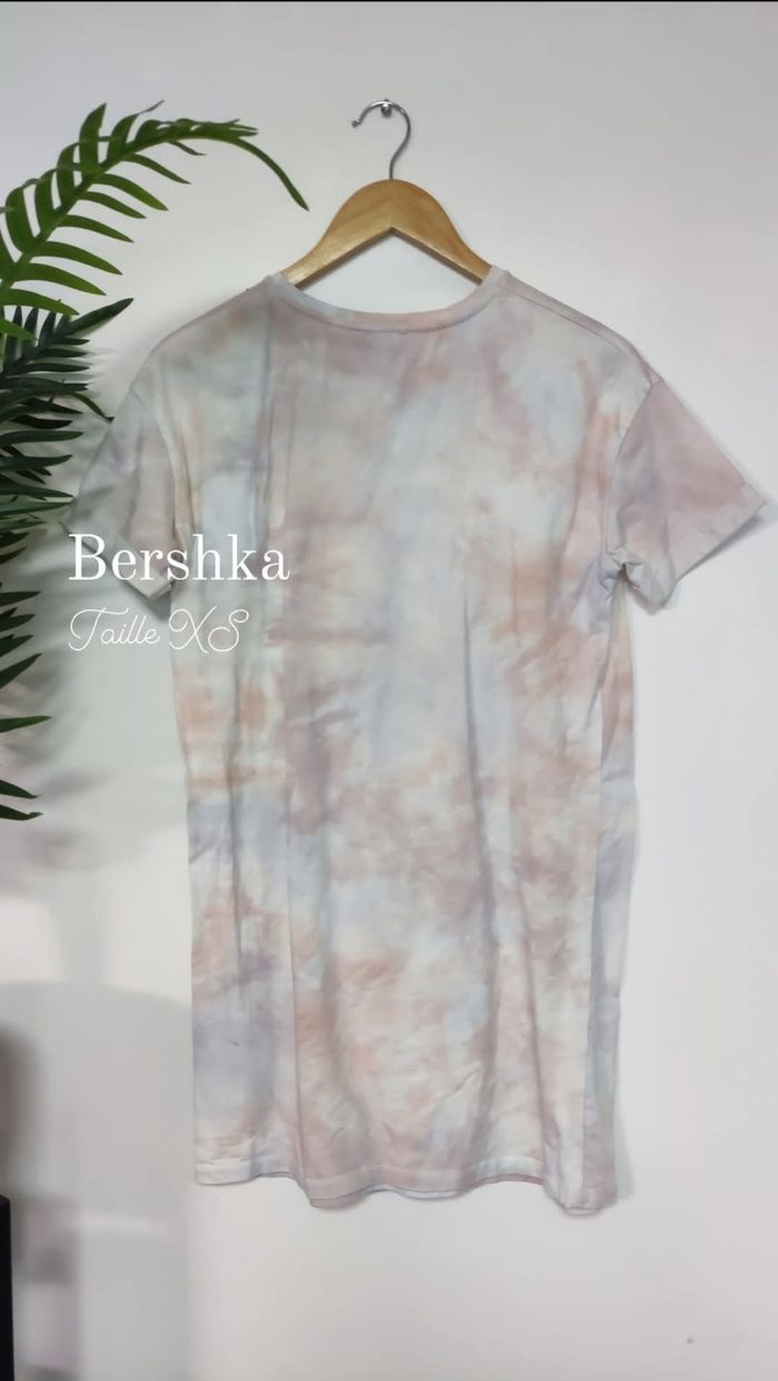 Robe tee-shirt oversize Taille 34 de chez Bershka Matière coton, elasthane Couleur blanc et rose très clair Neuf sans étiquette , je viens de faire une toute petite tâche en la posant faire la photo de l'étiquette.