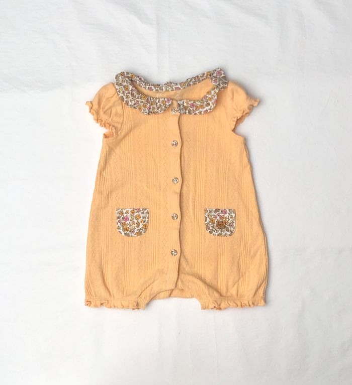 Très jolie combinaison courte été / combishort Sergent Major, Taille 1 mois/ 54 cm, Mini manches. En coton pointelle, maille ajourée, de couleur plutôt abricot (pas jaune). Jolis détails : collerette en tissu fleuri style Liberty, dans les tons roses, marrons, jaunes, orange, vert clair, avec des poches et des boutons dans le même tissu. Ouverture intégrale, avec des boutons, sur tout l’avant et des pressions entre les jambes. Comme neuve, aucun signe d’utilisation. Si besoin, le bouton de rechange est encore cousu sur l'étiquette. 🌸 Vous aimez cet article ? N’oubliez pas de visiter le reste de mon dressing en filtrant les tailles.