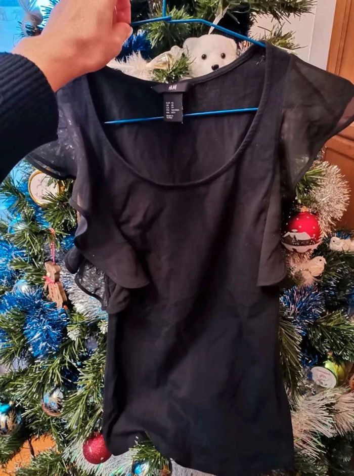 T-shirt noir de fête de marque H&M taille XS avec petit volants fluides au niveau des épaules #teeshirt#teeshirtfemme#fetes#fetesdefindannée#volants#noir#hm#hmfemme34#style#stylefashion#