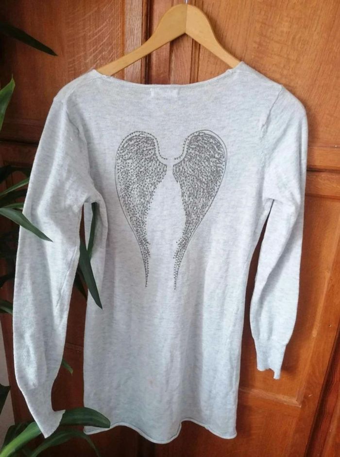 Pull assez long avec strass en forme d'aile d'anges. En très bon état Une toute petite tâches à l'arrière qui ne pars pas. Taille 40 Acheté en boutique privée à 50€. #pulloversize #pullleger #pullfemme