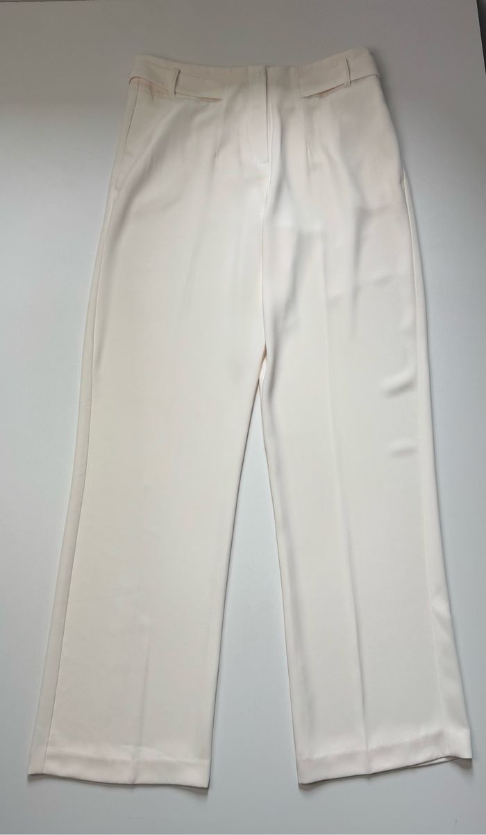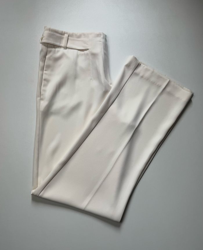 Pantalon blanc chic signé Jacqueline Riu, parfait pour une tenue élégante et estivale. Coupe droite légèrement ample, tissu fluide et agréable à porter. Ceinture intégrée à passants et fermeture invisible pour un rendu épuré. Très bon état général, idéal pour le travail ou une sortie habillée.