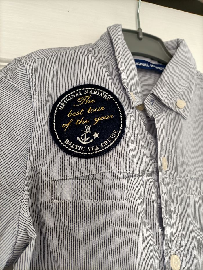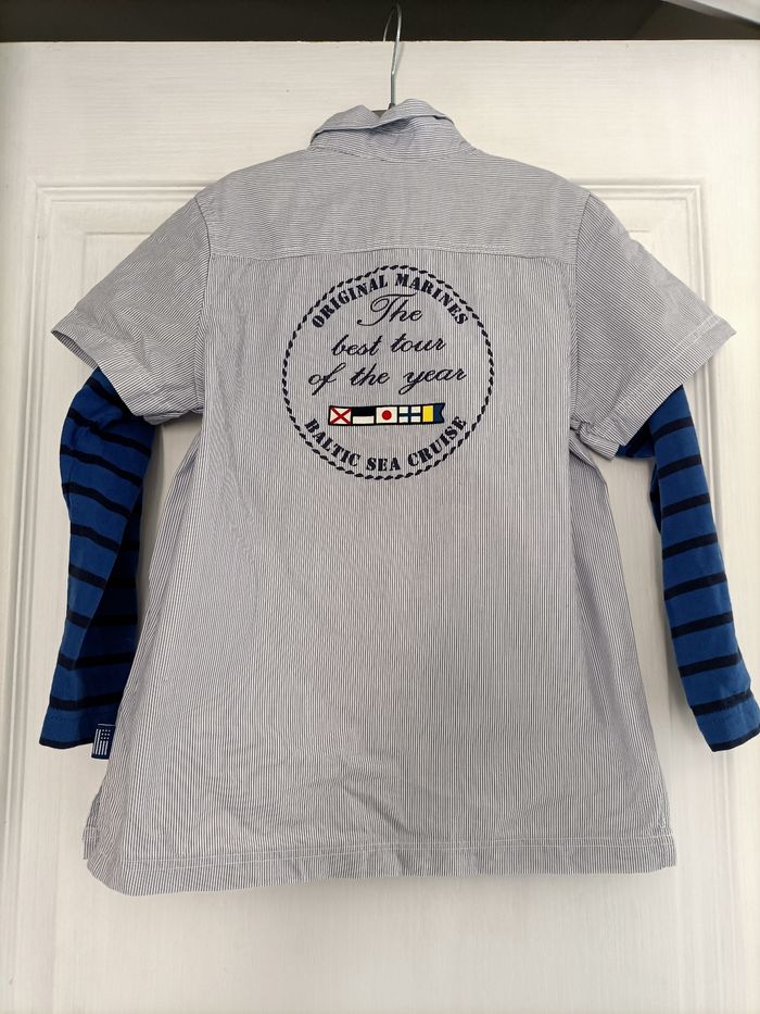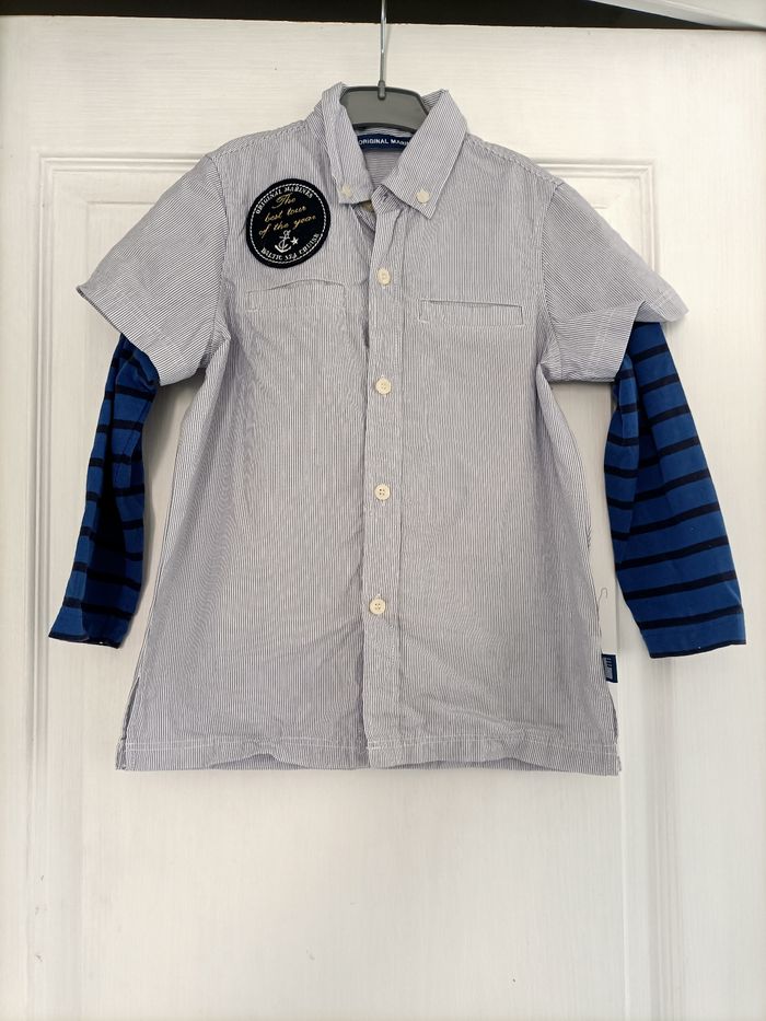 Chemise à manches longues rayée bleue et blanche, avec manches en matière t-shirt à manches longues, effet sur-chemise, de la marque "ORIGINAL MARINES", taille 4 ans 4€