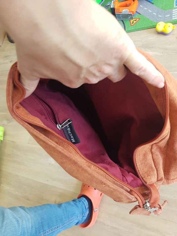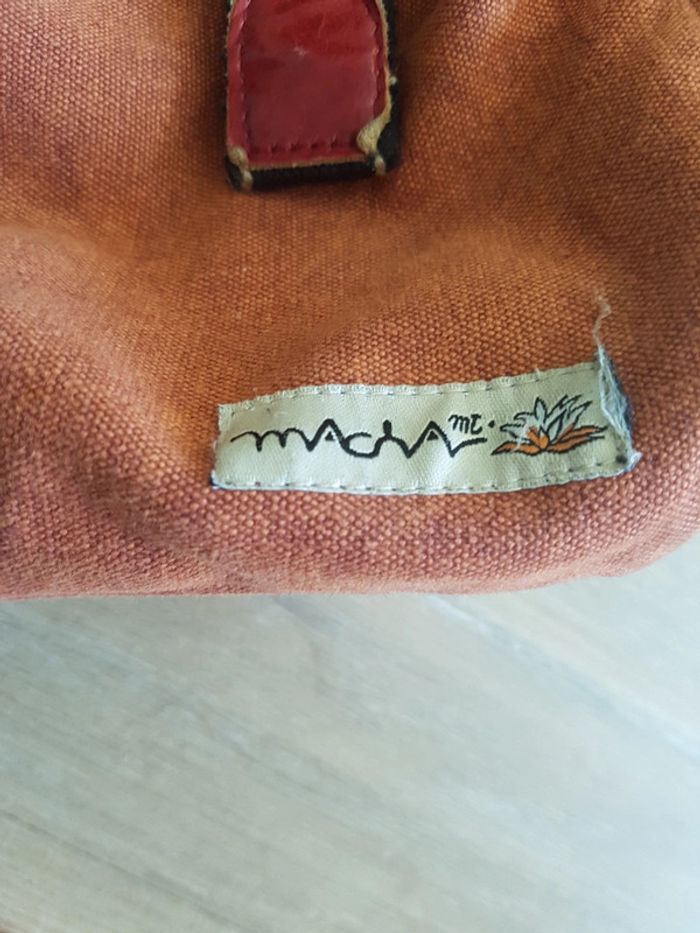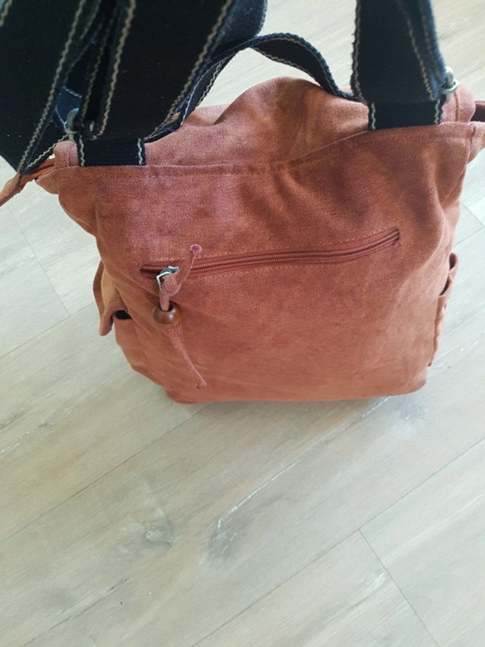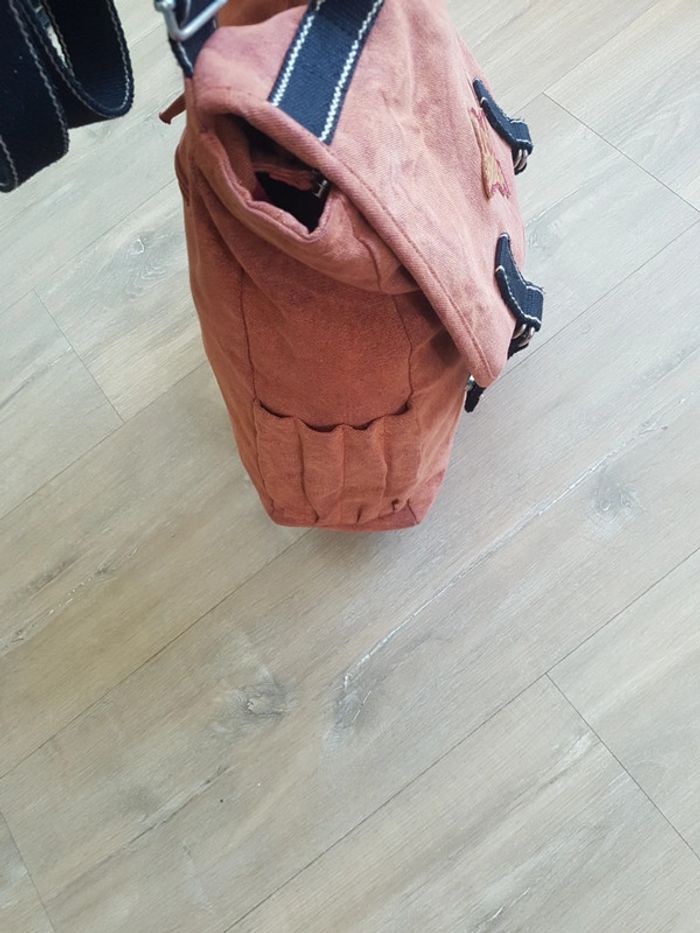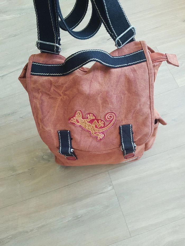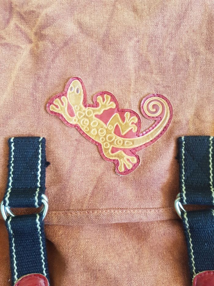 Sac bandoulière Macha Mt., en tissu marron orangé, avec salamandre sur le devant La bandoulière est réglable