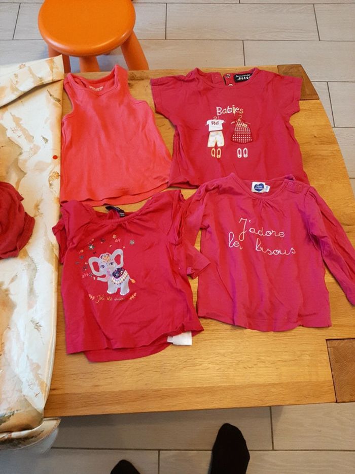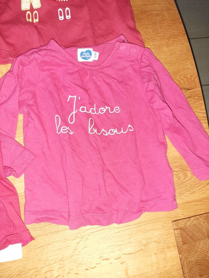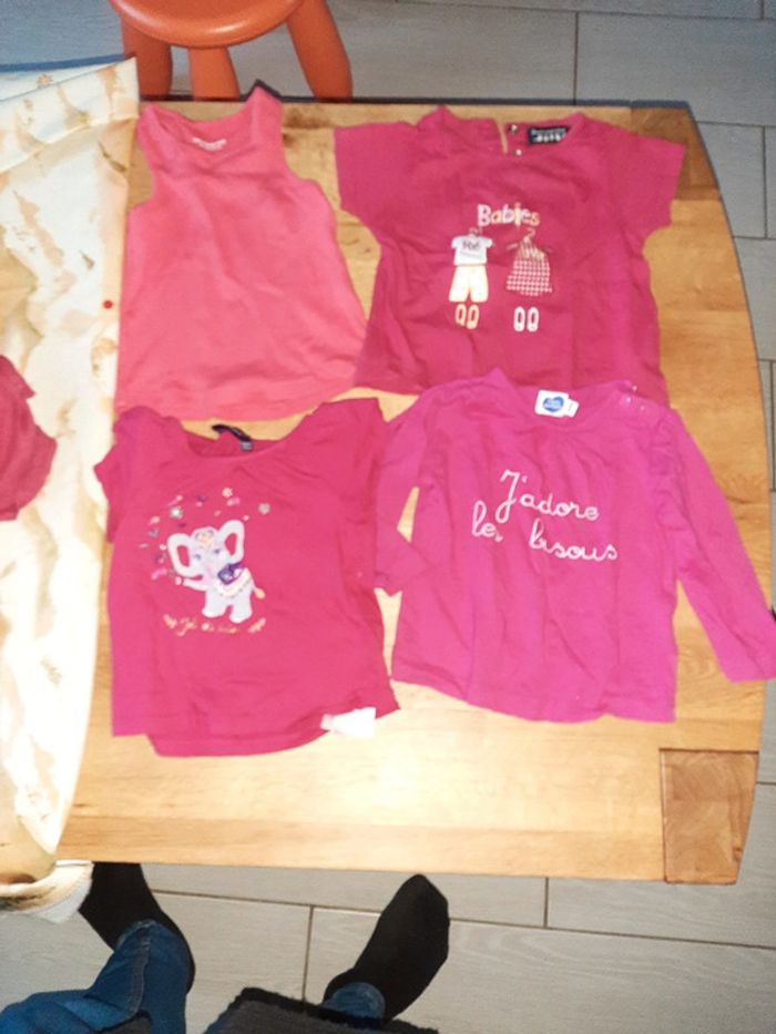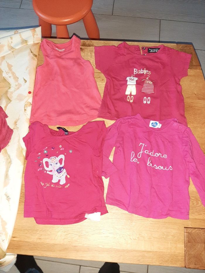 Lot de 4 haut fille 1 an 2 tee shirt 1 débardeur 1 haut à manche longues Tous les haut sont rose de différentes teintes Le haut elephant est de sergent major Le haut j'adore les bisous est de mot d'enfant Le haut babies est de tout compte fait Et le haut débardeur est de verbaudet Tous en très bonne etat