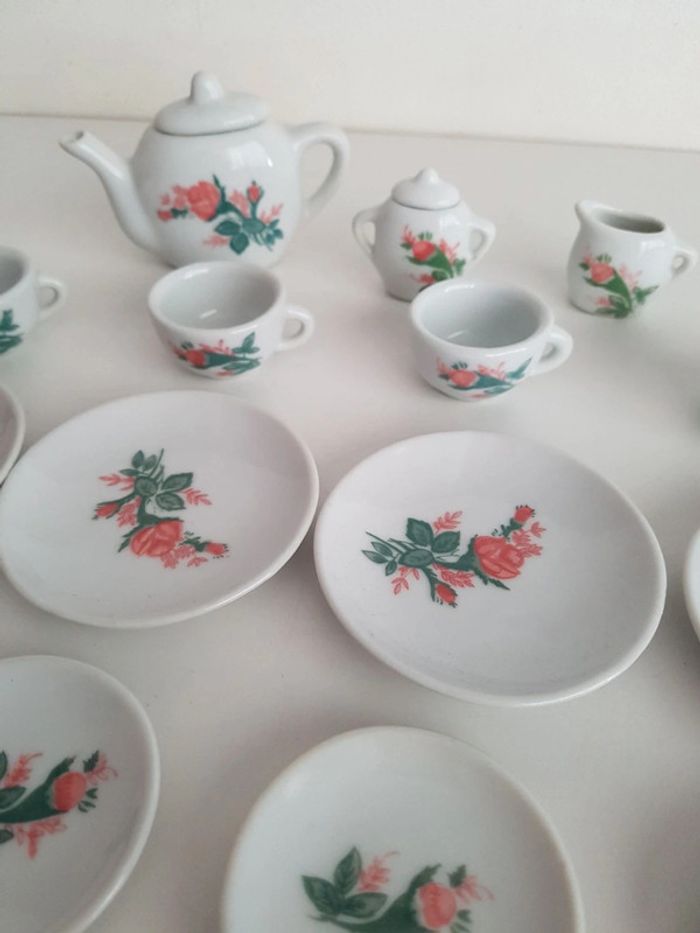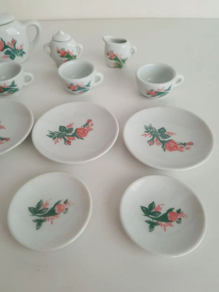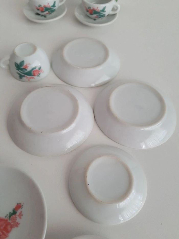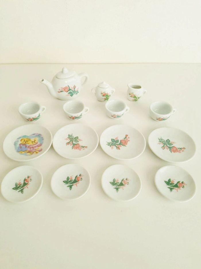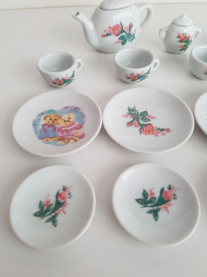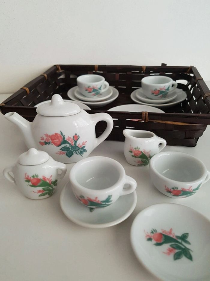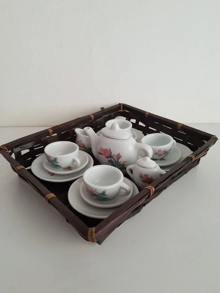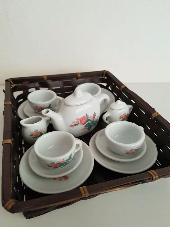 Panier en osier avec service à thé ou café vintage (tea party), des jouets d'imitation pour jouer à la marchande, dans la cuisine ou organiser un pique-nique. Une jolie dinette avec des motifs floraux. Un jeu de manipulation pour développer la motricité fine et apprendre le partage. Panier en osier rectangulaire, 1 théière avec couvercle (fissure sur l'arrière), 3 assiettes fleurs et 1 assiette ours, 4 coupelles, 4 tasses et 2 petits pots (pour crème et sucre) Panier vintage, un peu usé Dimensions du plateau : 19,5 × 25 cm Diamètre des grandes assiettes : 8,5 cm