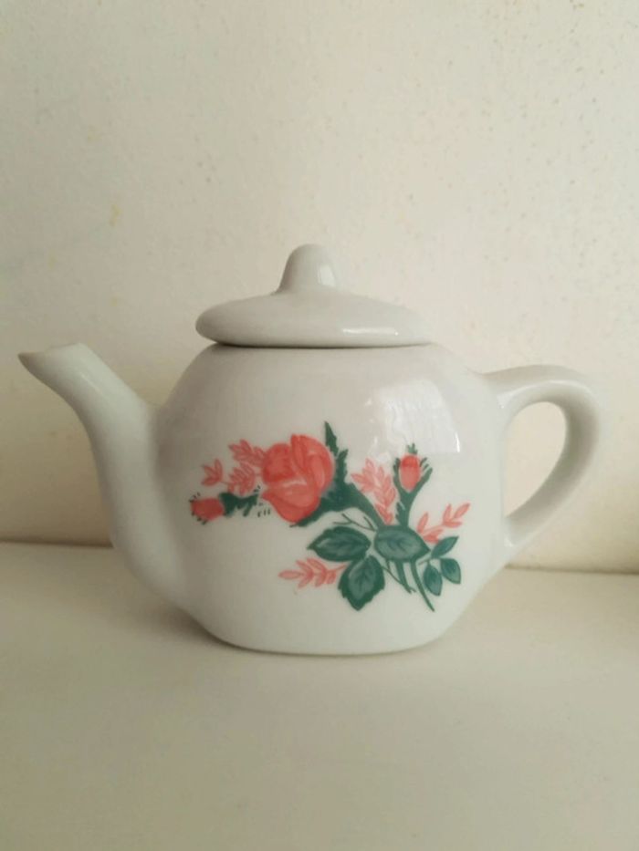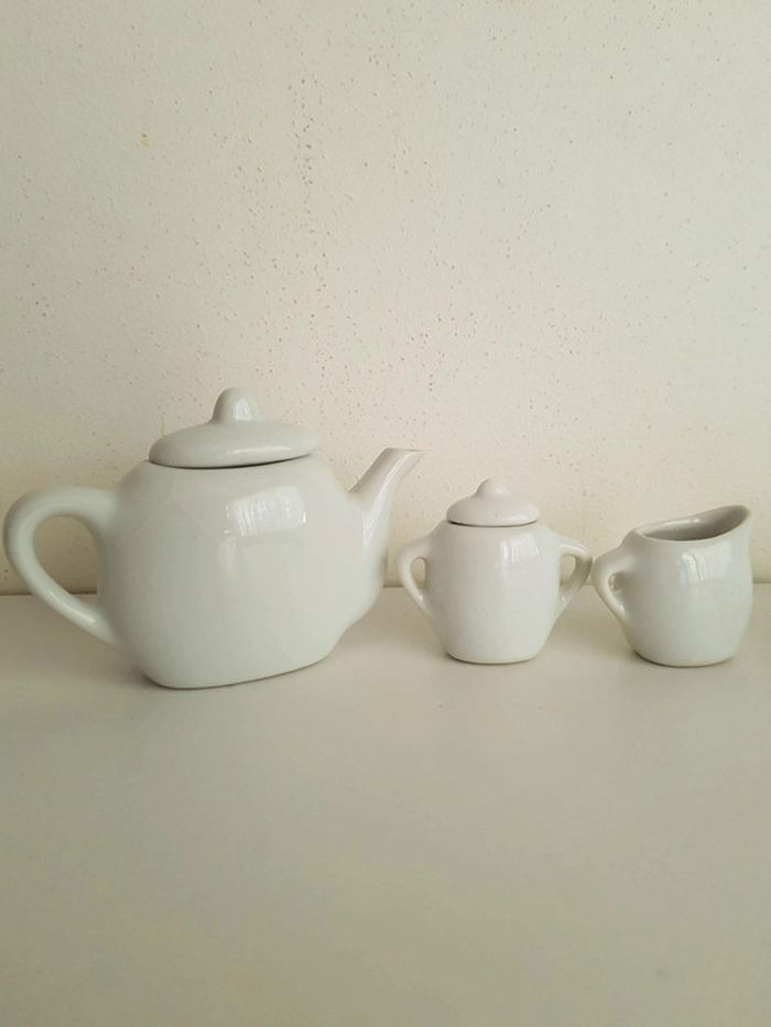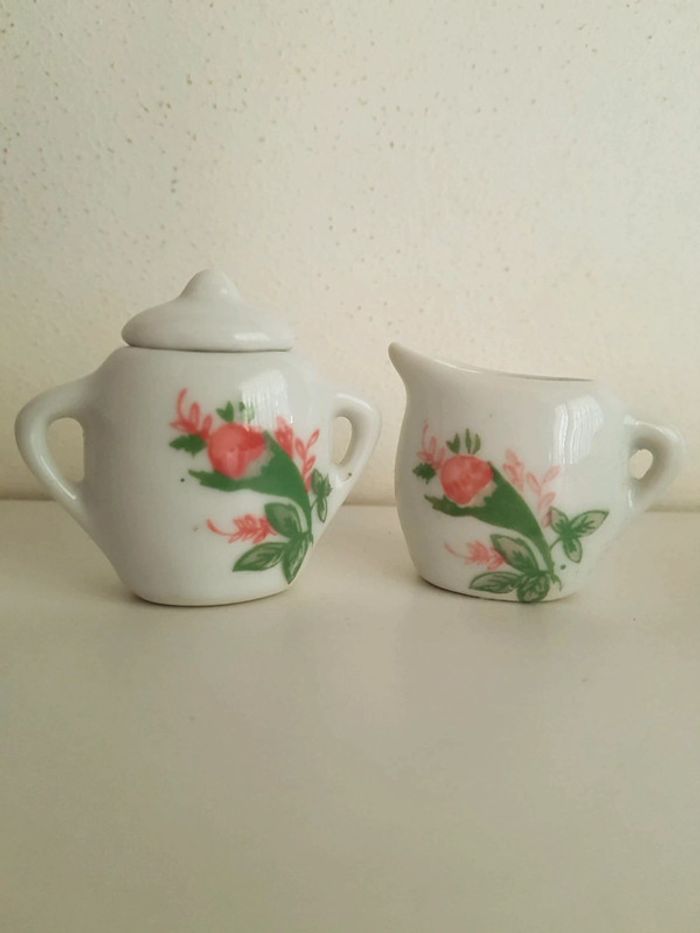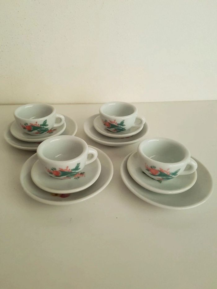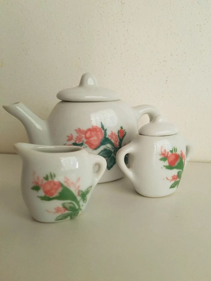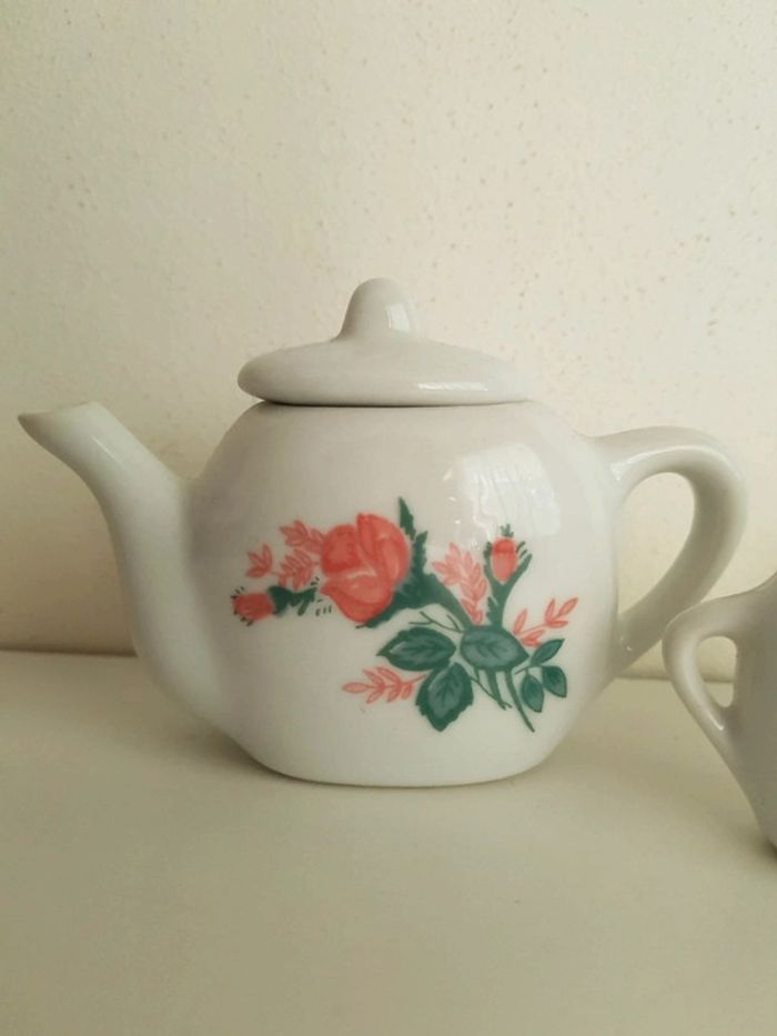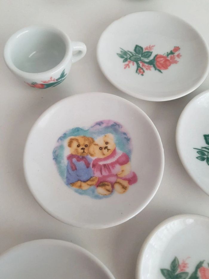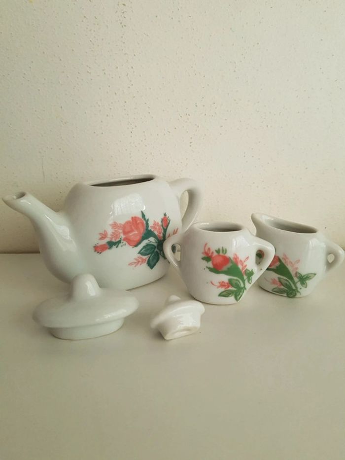 Panier en osier avec service à thé ou café vintage (tea party), des jouets d'imitation pour jouer à la marchande, dans la cuisine ou organiser un pique-nique. Une jolie dinette avec des motifs floraux. Un jeu de manipulation pour développer la motricité fine et apprendre le partage. Panier en osier rectangulaire, 1 théière avec couvercle (fissure sur l'arrière), 3 assiettes fleurs et 1 assiette ours, 4 coupelles, 4 tasses et 2 petits pots (pour crème et sucre) Panier vintage, un peu usé Dimensions du plateau : 19,5 × 25 cm Diamètre des grandes assiettes : 8,5 cm