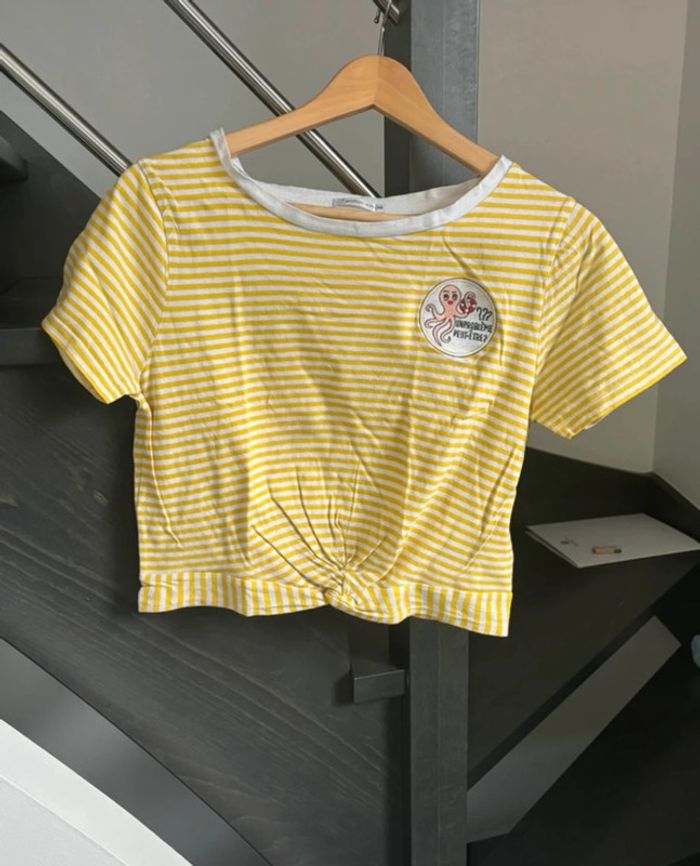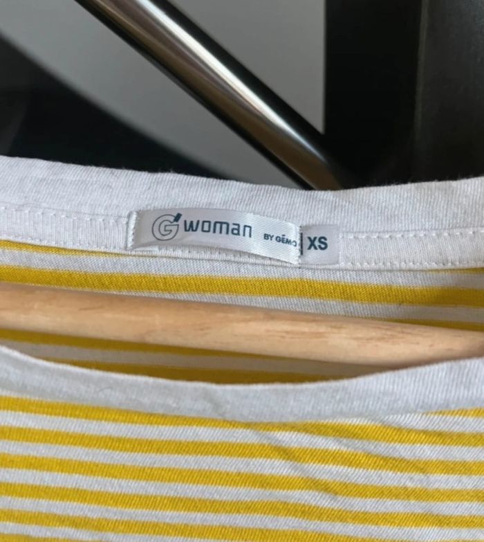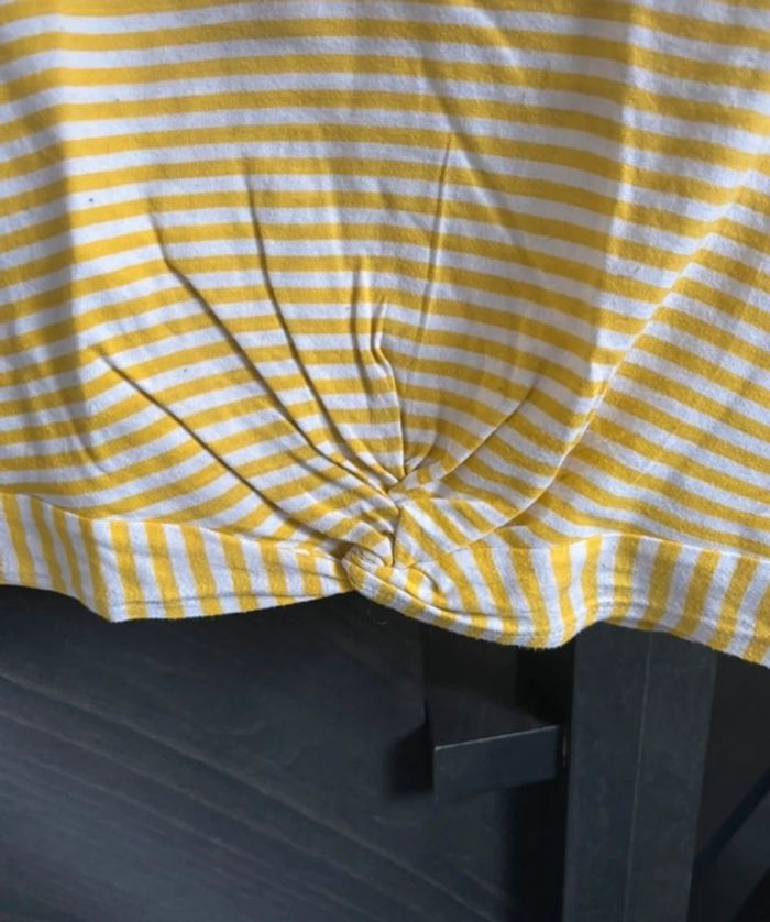 Très joli haut court rayé jaune et blanc noeud sur le devant .marqueGemo taille xs.en très bon état. #hautfemme #hautcourt #undiz #tresbonetat