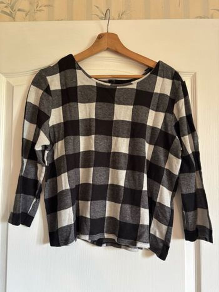 Blouse pimkie noir et blanche manche 3/4 Assez épaisse donc parfaite pour la mie saison À des boutons dans le dos Vendu avec un bouton de rechange sur l’étiquette Style damiers A écrit taille M mais correspond vraiment à un S Porté une ou 2 fois, reste en très bon état