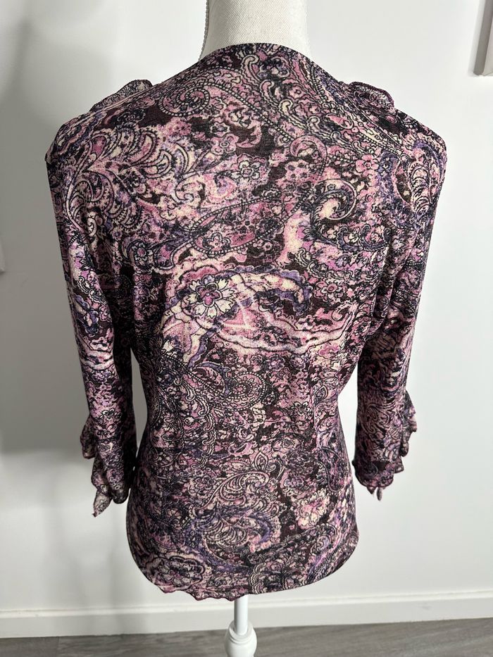 Blouse - Excellent état - Taille 40 équivalent L - Manches 3/4 - Style Y2K - Violette et rose - Col en V avec froufrous - Tissus stretch - Légèrement transparente - Pas d’étiquette de taille ni de matière Dimensions: - 50 à 60cm niveau aisselles - 60cm de long