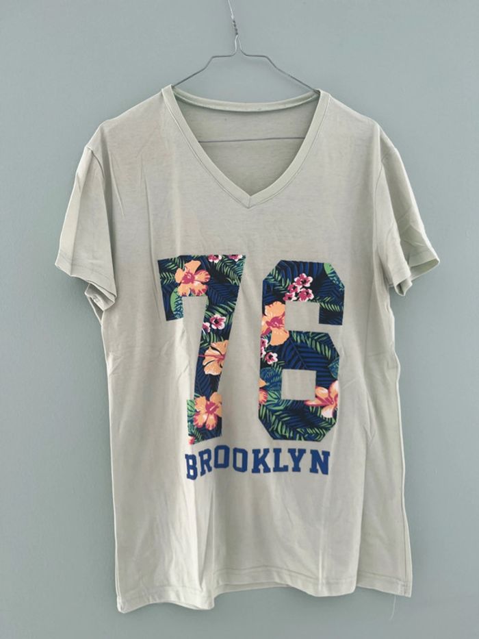 T-shirt à manches courtes vert pale pastel, avec chiffre 76 motifs tropical et écriture « brooklyn » Taille L