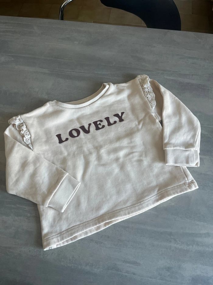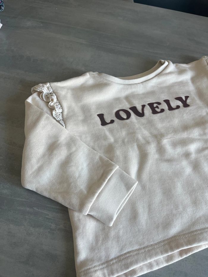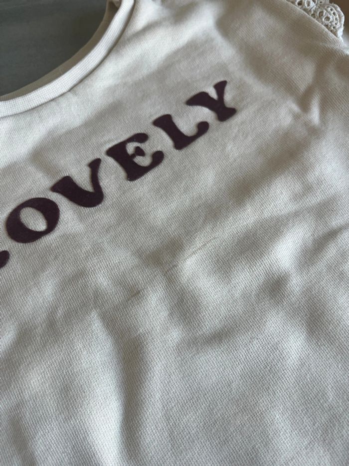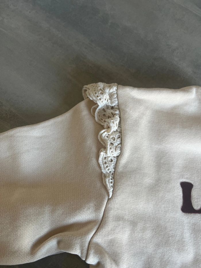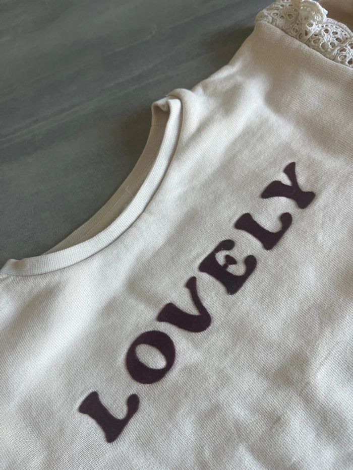Sweat-shirt beige avec broderie dentelle aux épaules et écriture « Lovely » en velour bordeau Léger trait (voir photo) Storytelling Taille 3ans