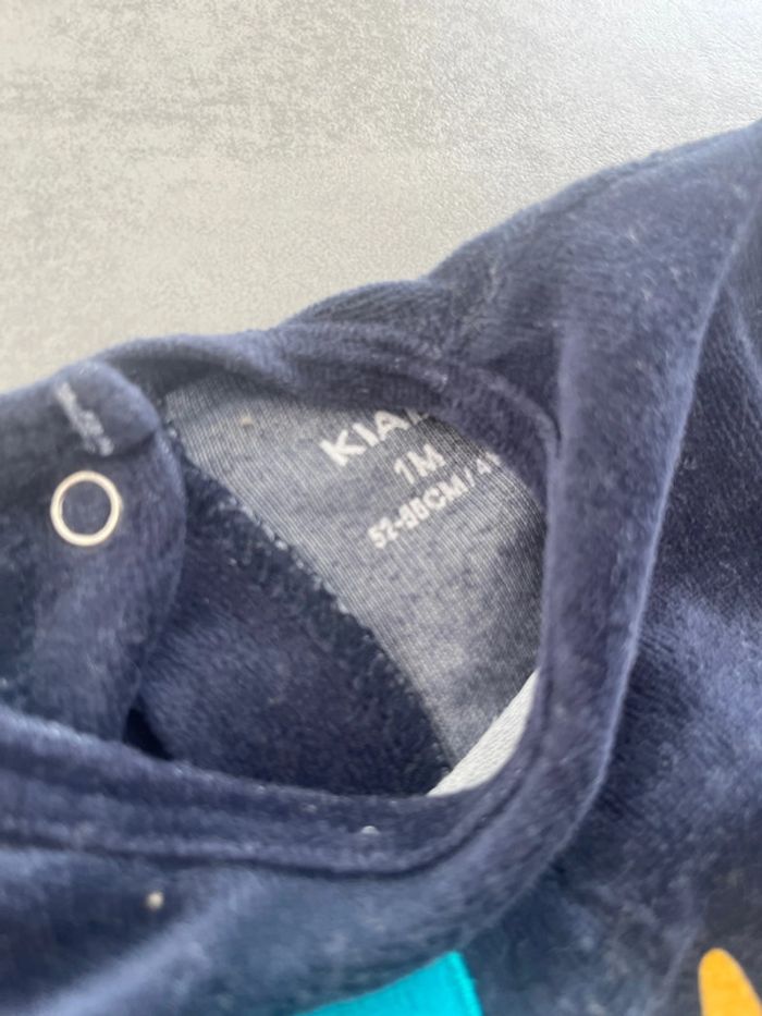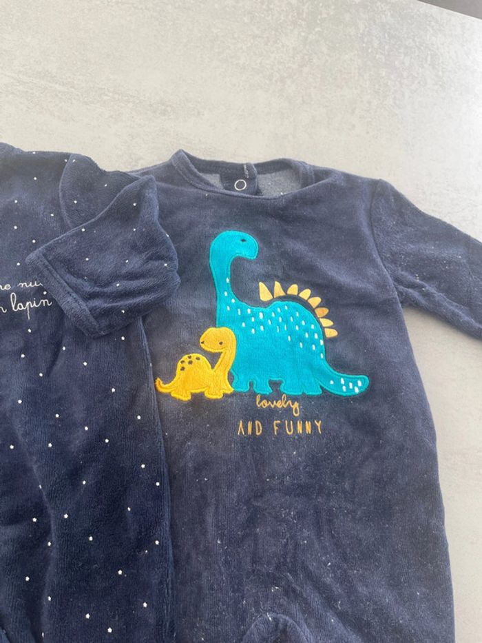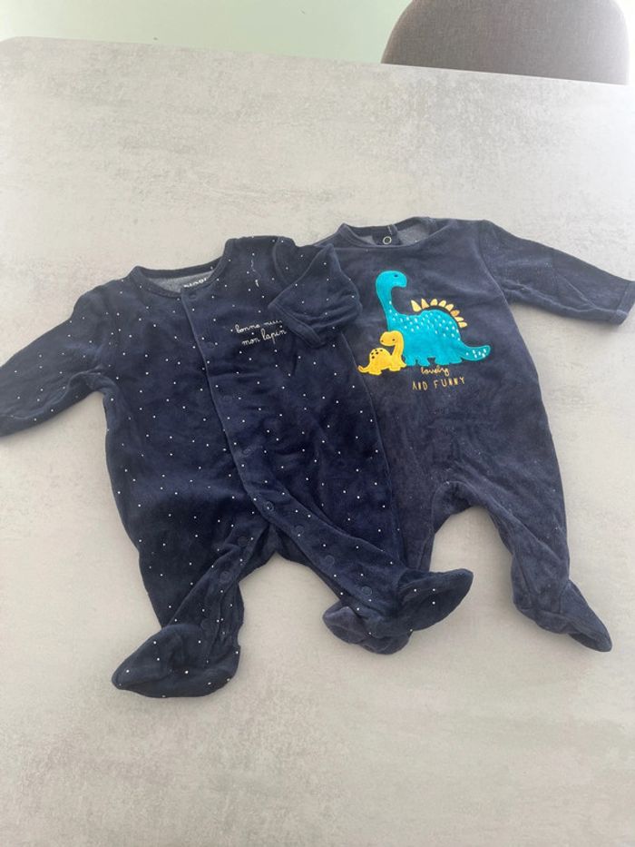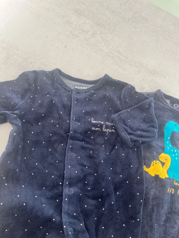 Lot de 2 pyjamas une pièce en velour bleu marine un ouverture à l’avant et un ouverture à l’arrière. Dinosaure étoile Kiabi 1mois