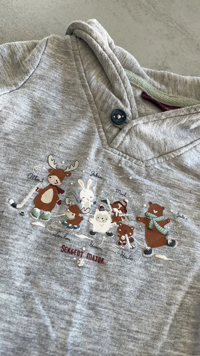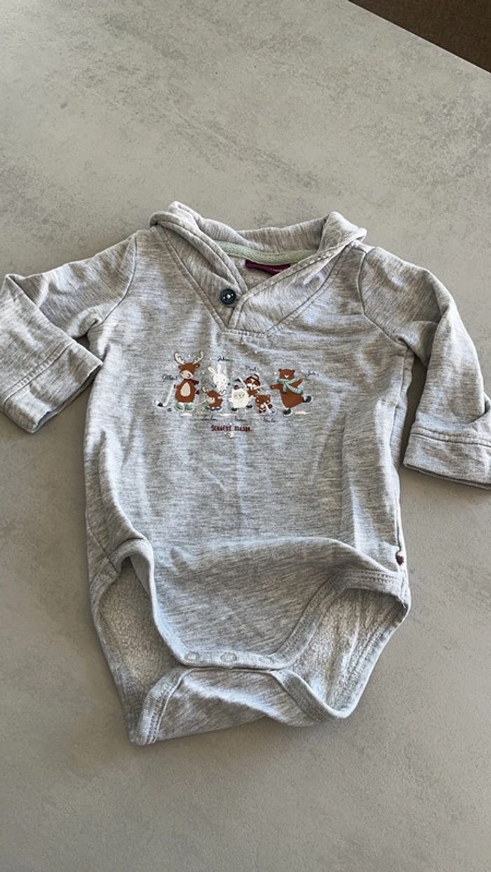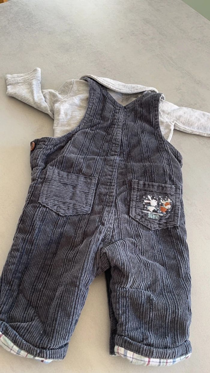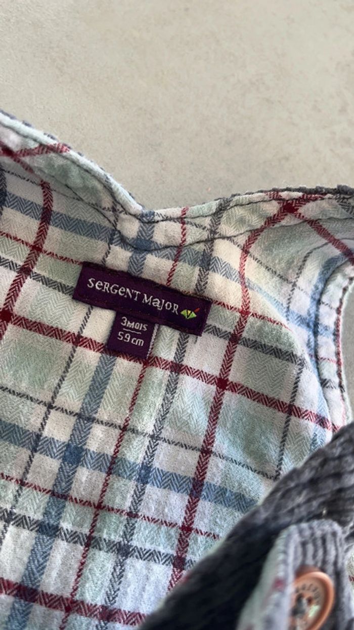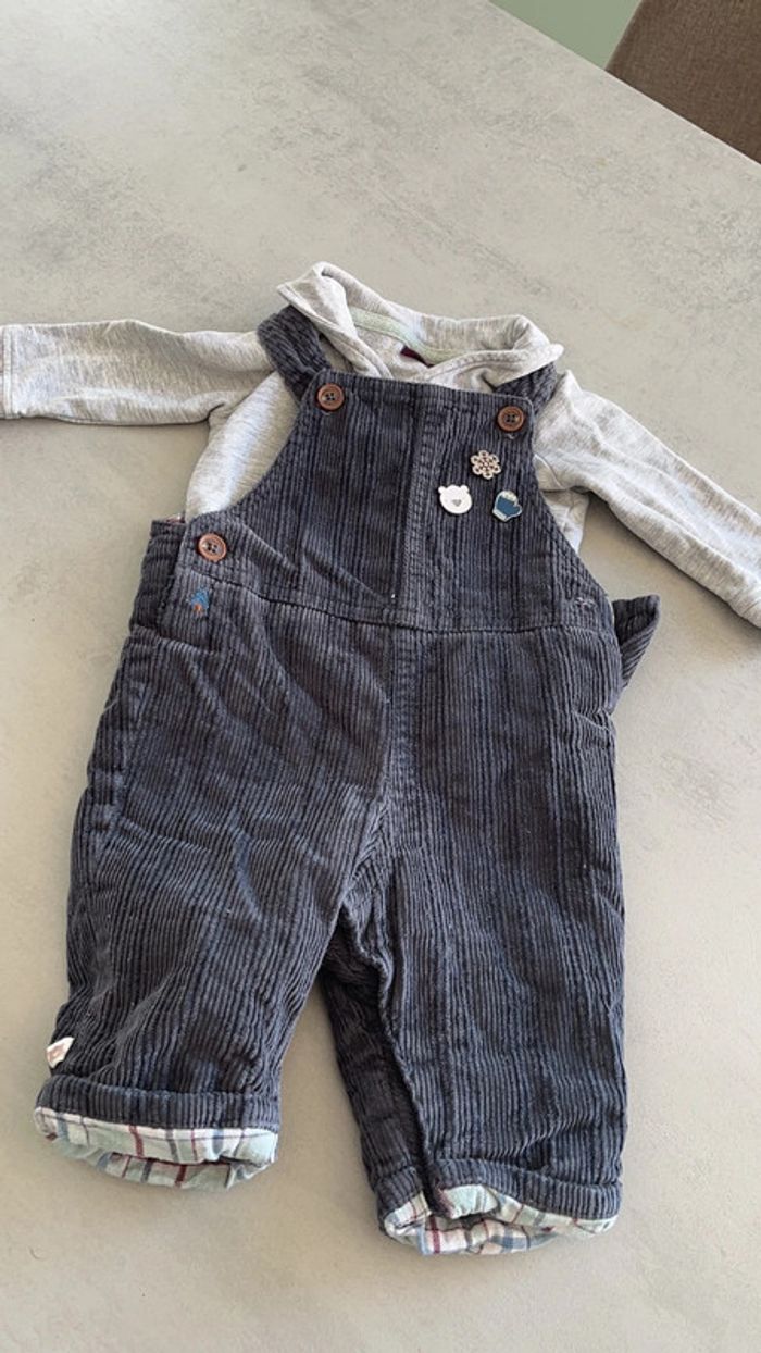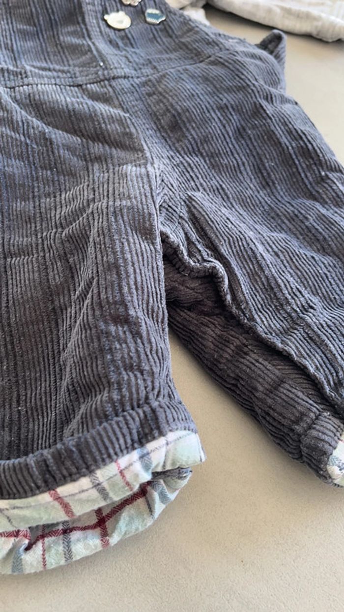 Salopette en velour côtelé grise bleu foncé doublure à carreaux pins hiver Body gris chiné avec col animaux de la montagne Sergent major 3mois