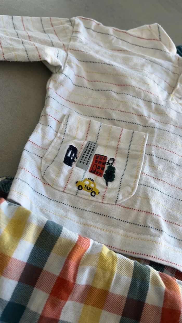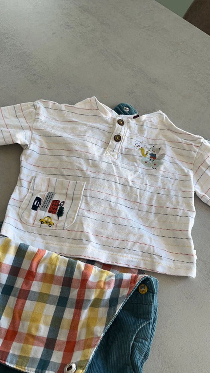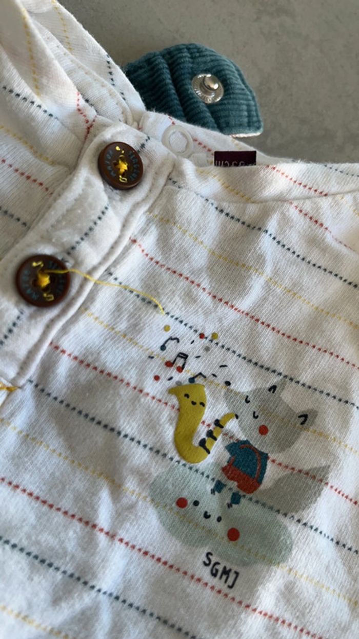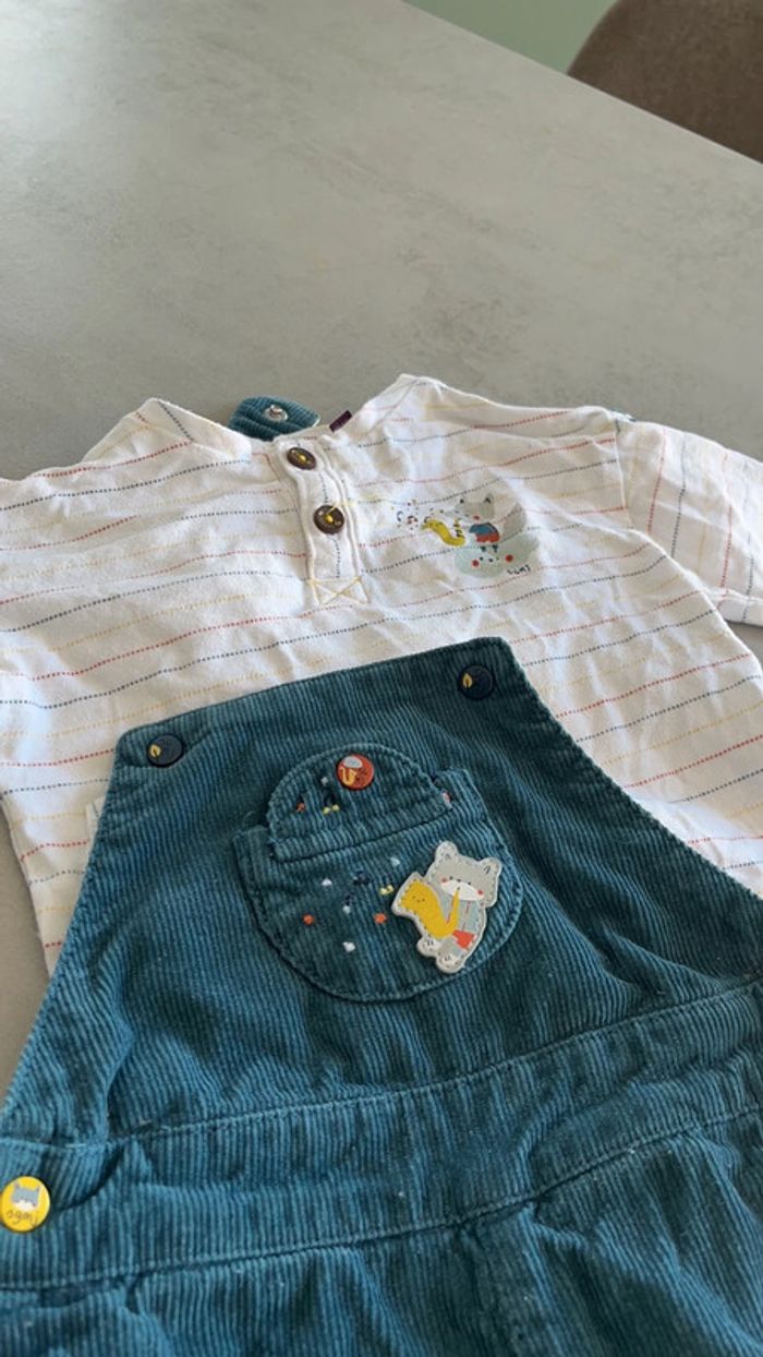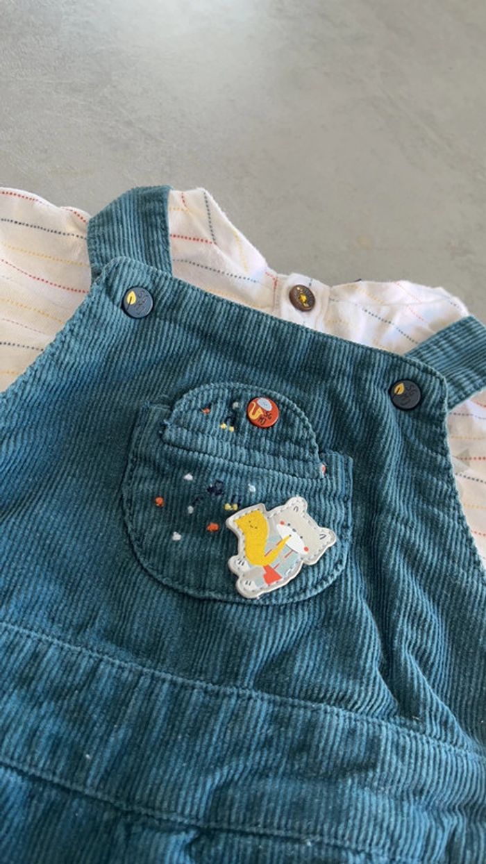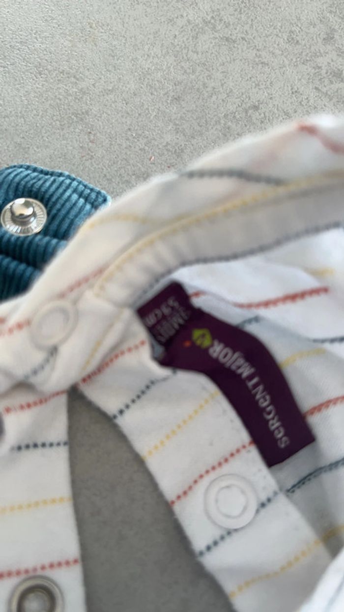 Salopette en velours côtelé bleu canard TEE shirt a manches longue blanc rayures colorés Sergent major 3mois