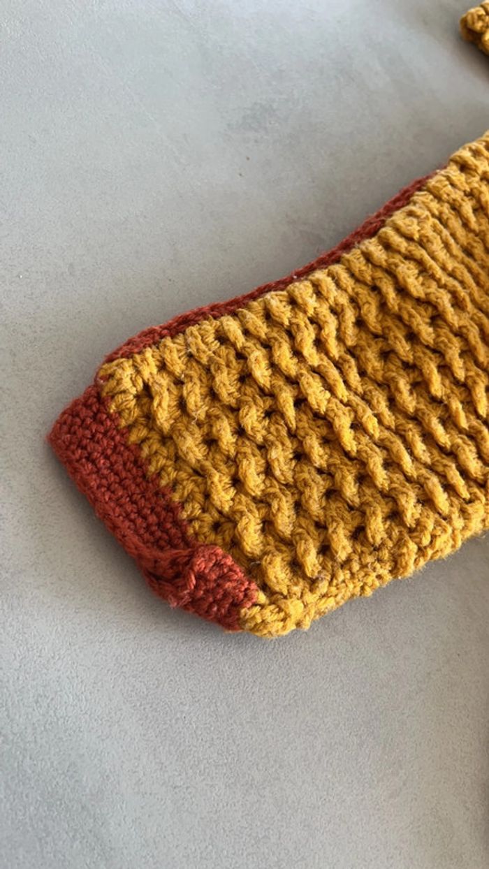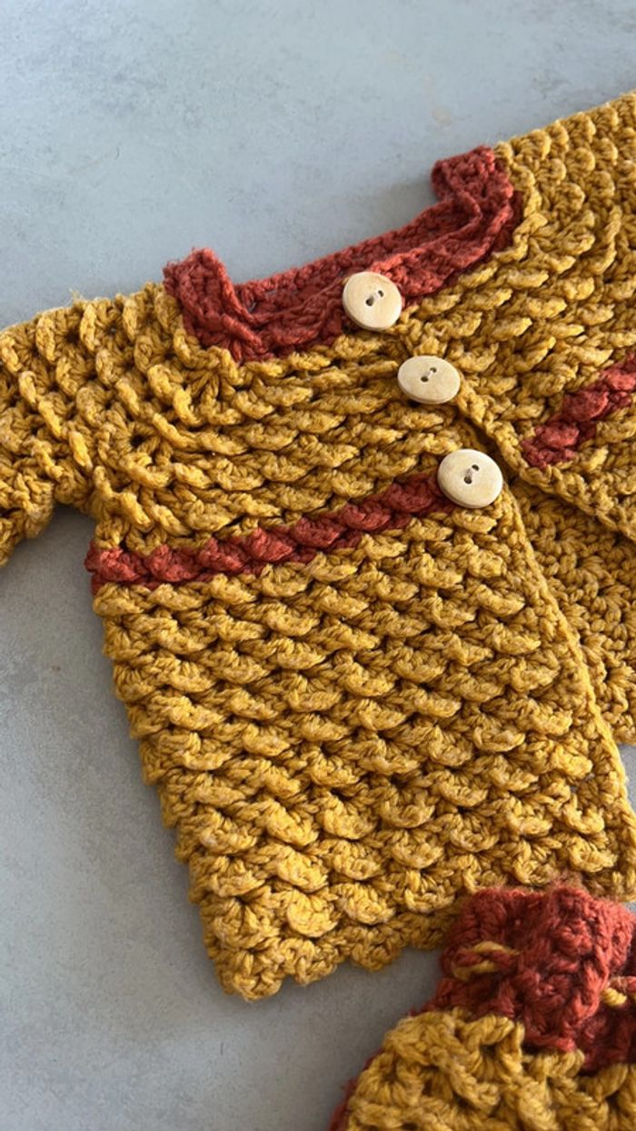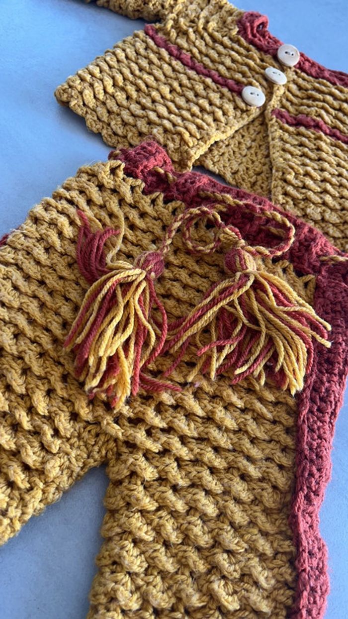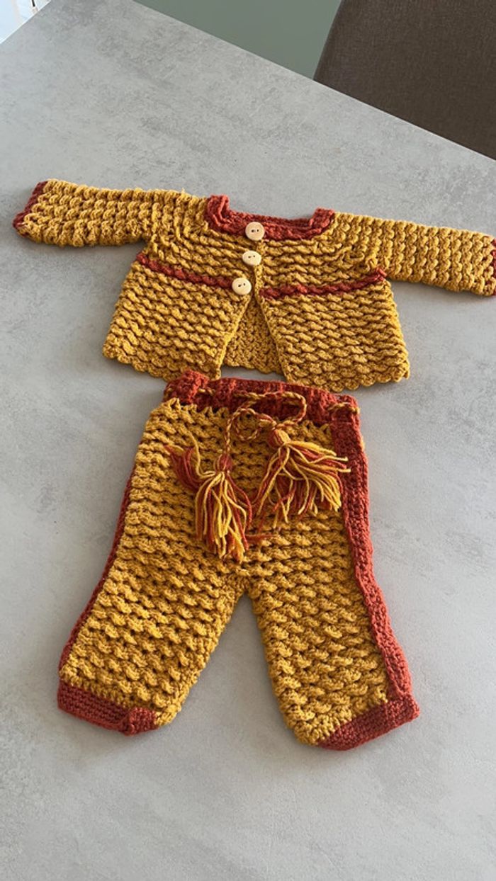 Ensemble moutarde et camél tricoté à la main Gilet plus pantalon 3mois