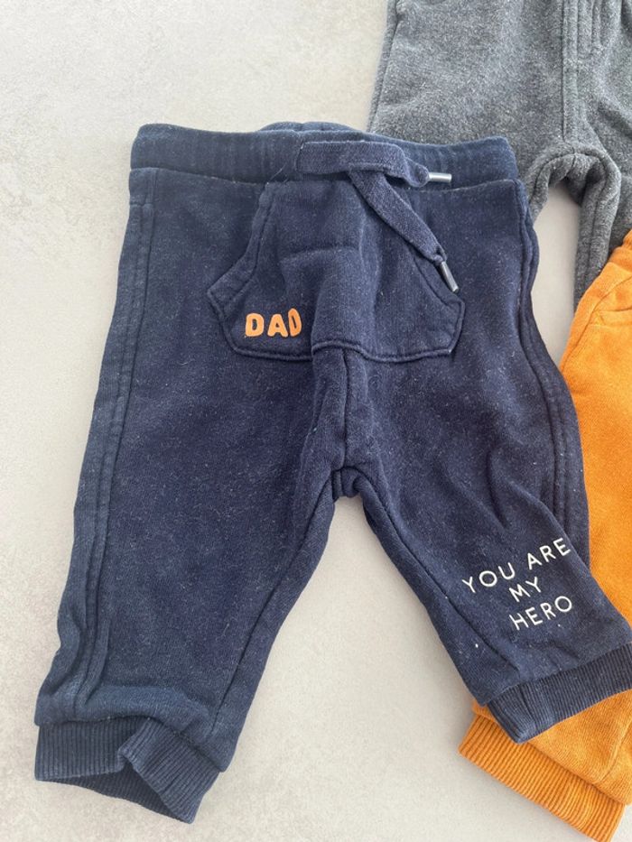Lot de 3 pantalons Jogging marine « dad you are My héros » Jogging moutarde Pantalon pince molletonné stretch Kiabi 3mois 3mois