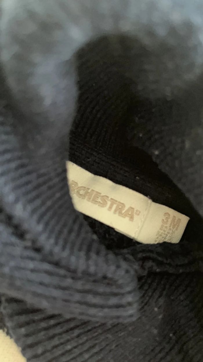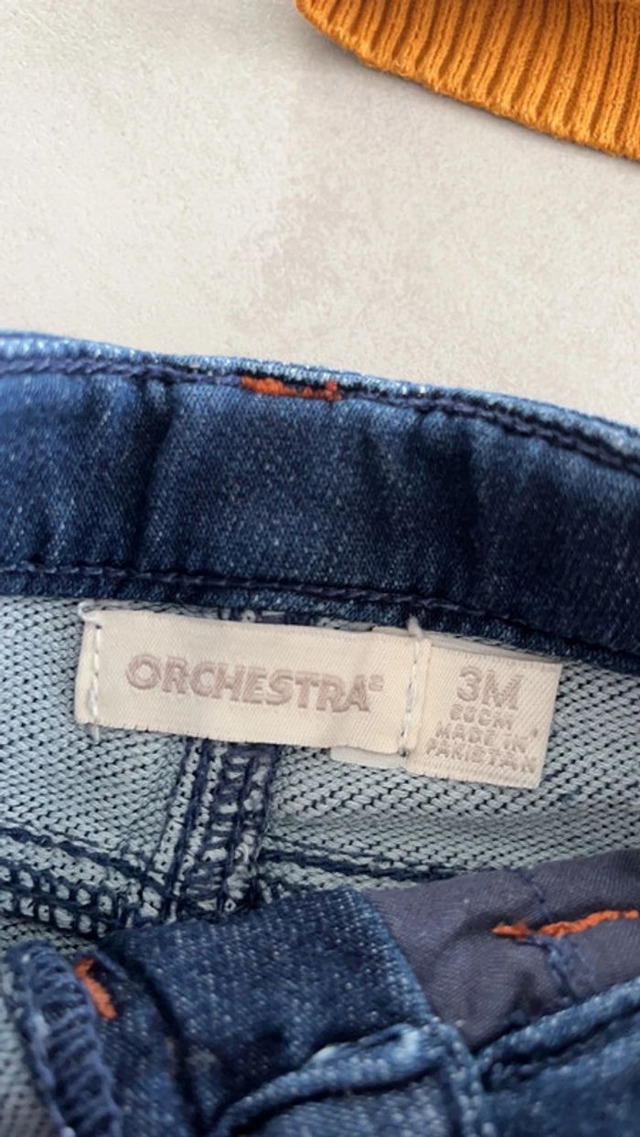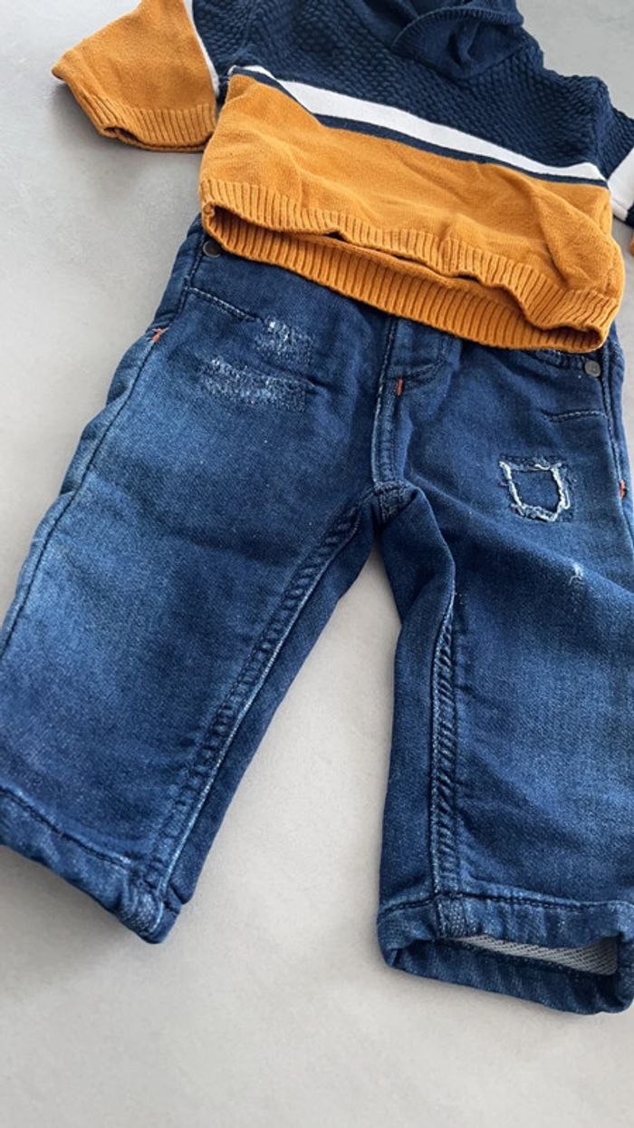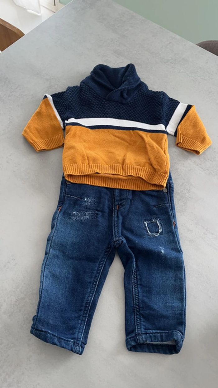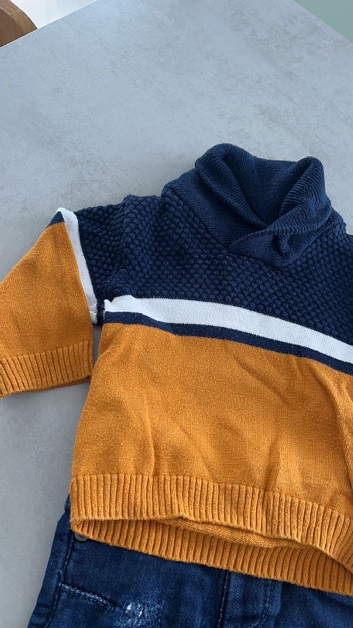 Jeans stretch avec pull col roulé en V bleu marine et moutarde. 3mois Orchestra
