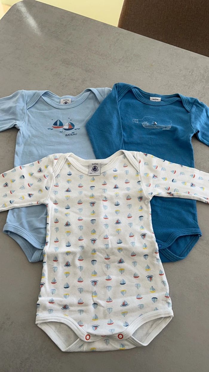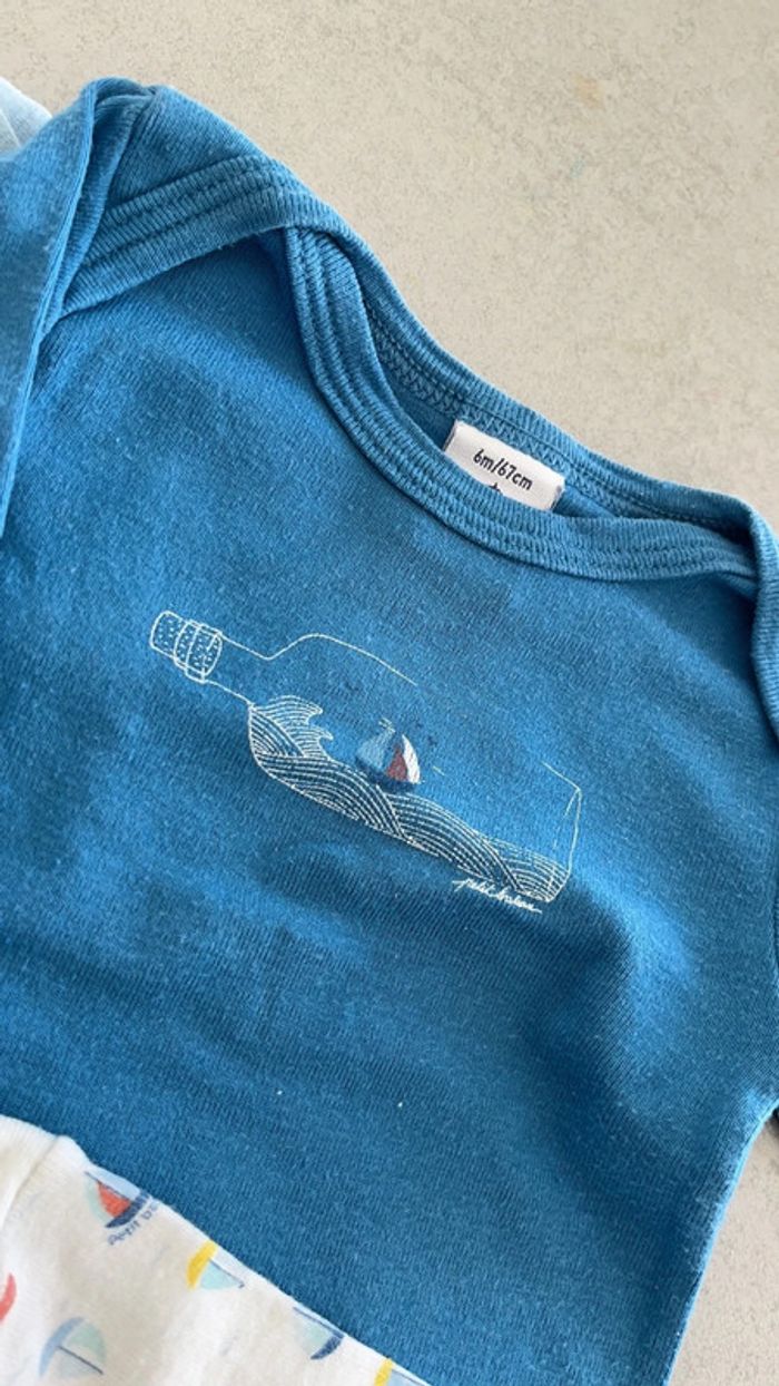 Lot de 3 bodies nuance de bleu motifs bateaux Petit bateau 6mois