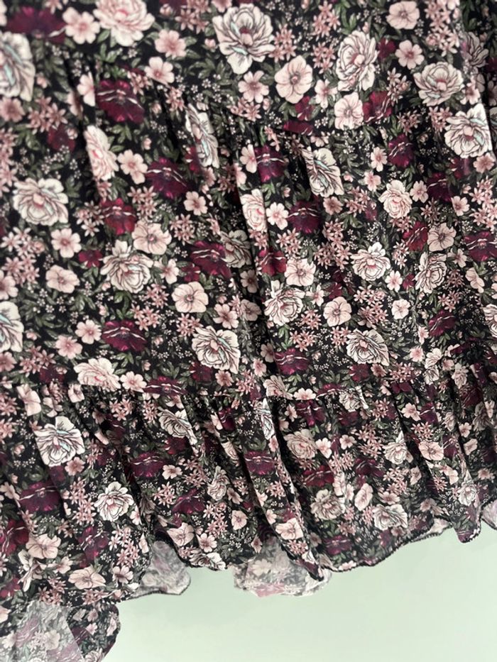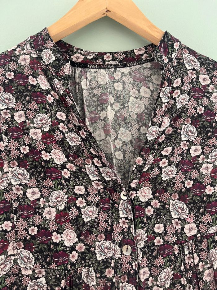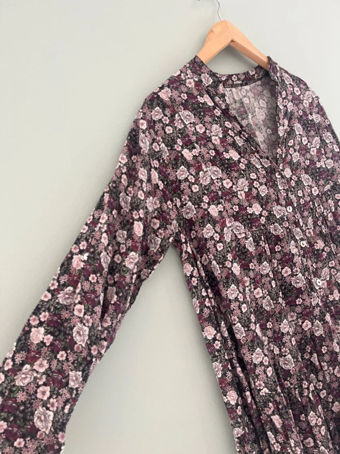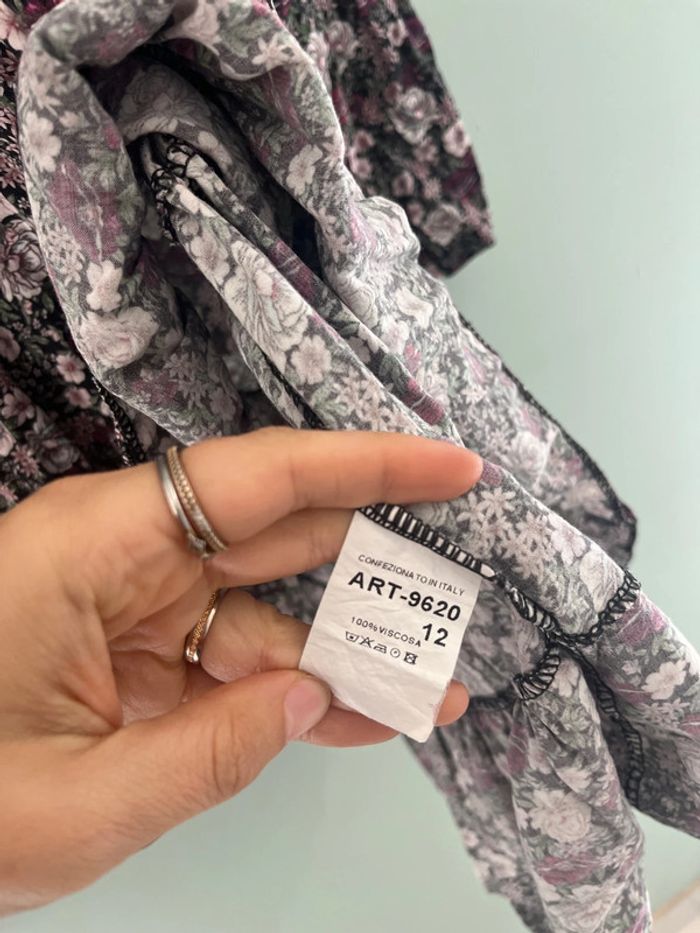 Robe courte à manches longues froncé au niveau de la jupe motifs fleur mauve grise Fabrication italienne Made in italy Taille unique