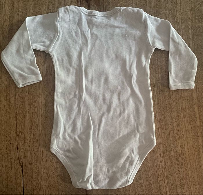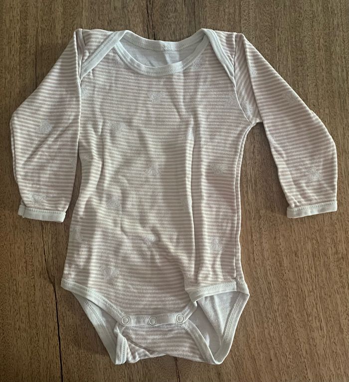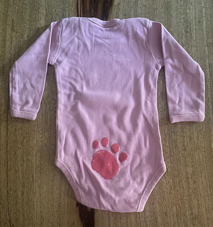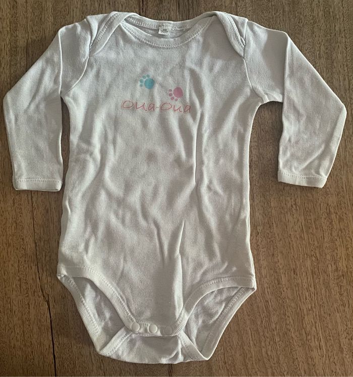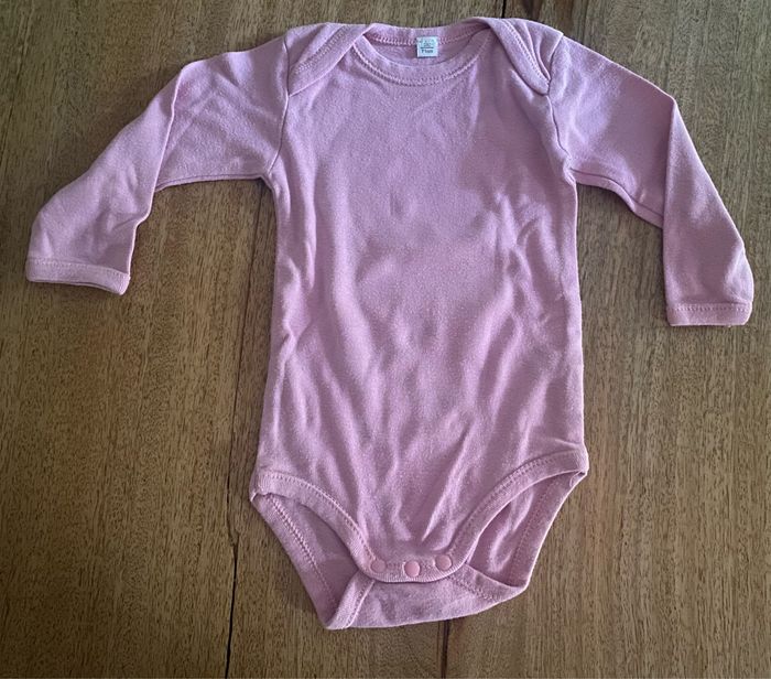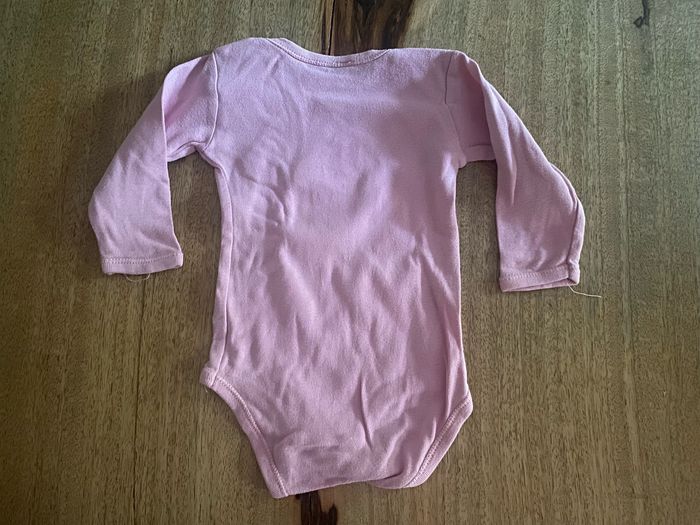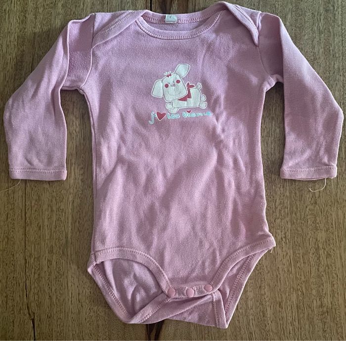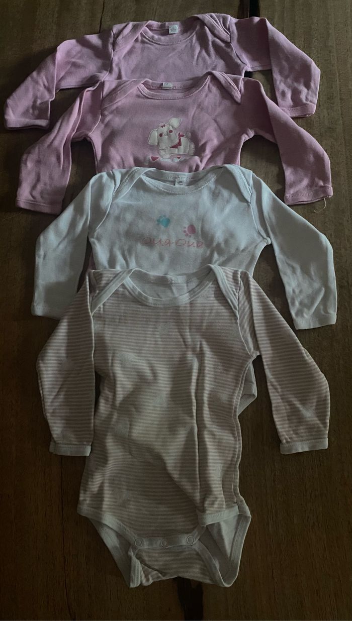 4 body, manches longues rose et blanc avec des dessins voir photo. Sans taches. 100 % coton 3 pressions au niveau de la couche.