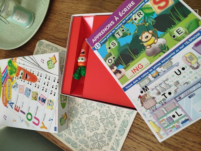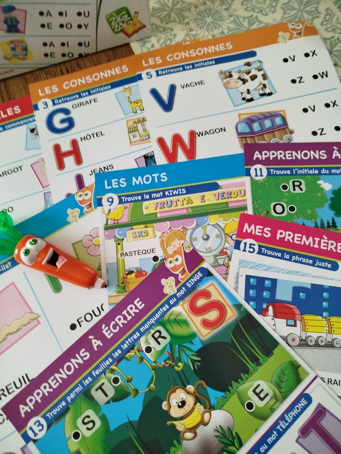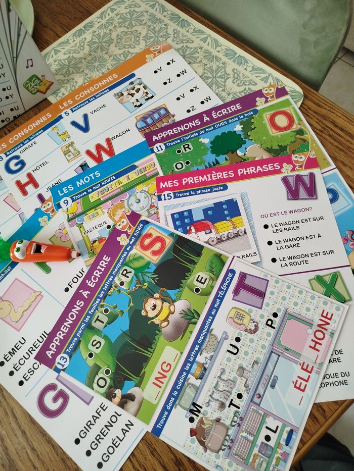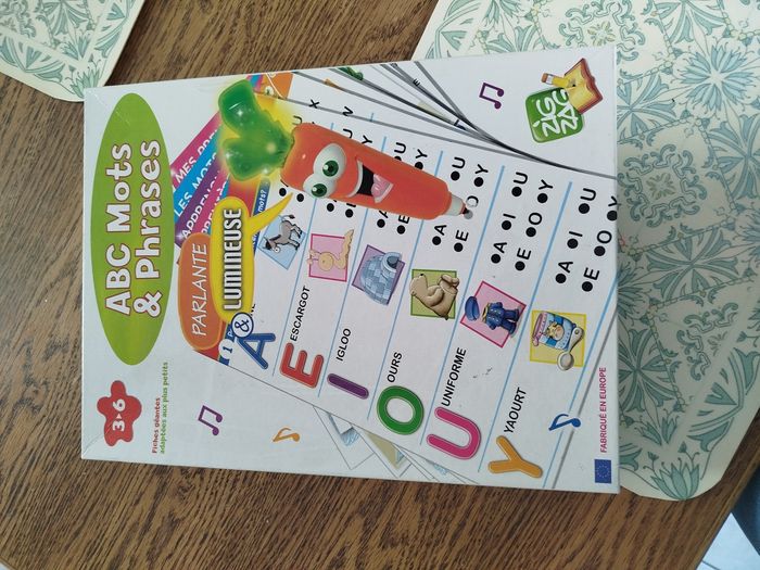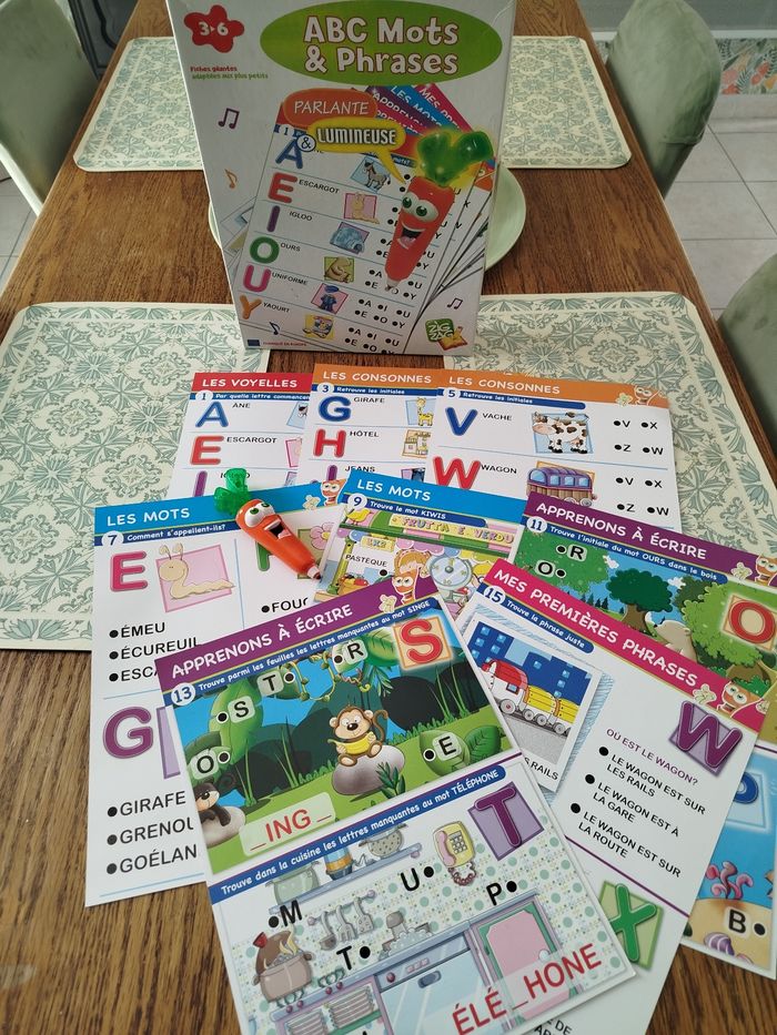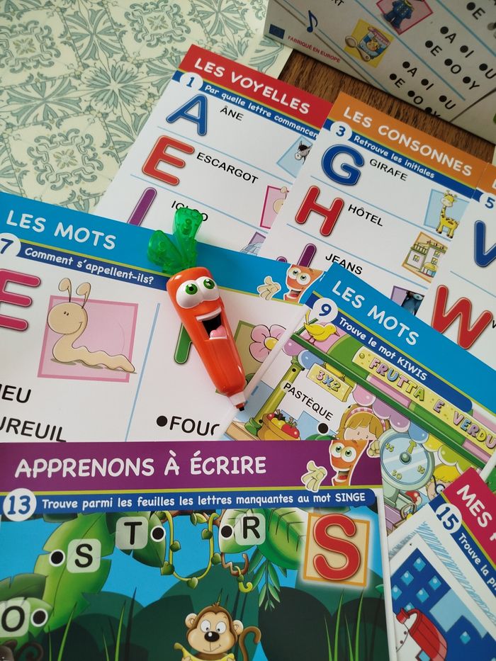 En parfait état, complet et fonctionne parfaitement. Une carotte qui parle et s'illumine avec 16 maxi fiches pédagogiques électronique. Les maxi fiches de la super carotte bip sont conçus pour de jeunes enfants elles sont de grands formats et contiennent des illustrations et des textes claires. Grâce à un cours un parcours d'apprentissage riche et progressif, les enfants pour apprendre à reconnaître l'alphabet, à lire leurs premiers mots et à composer leur première phrase.